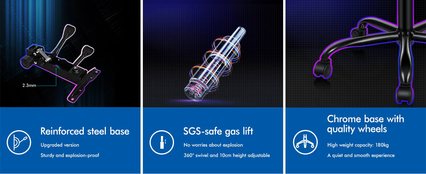 A stylish chrome base with TUV-certified casters, Intertek-approved PU leather upholstered in generous foam paddings, SGS-approved Gas-Lift system, delivering absolute five-star luxury.