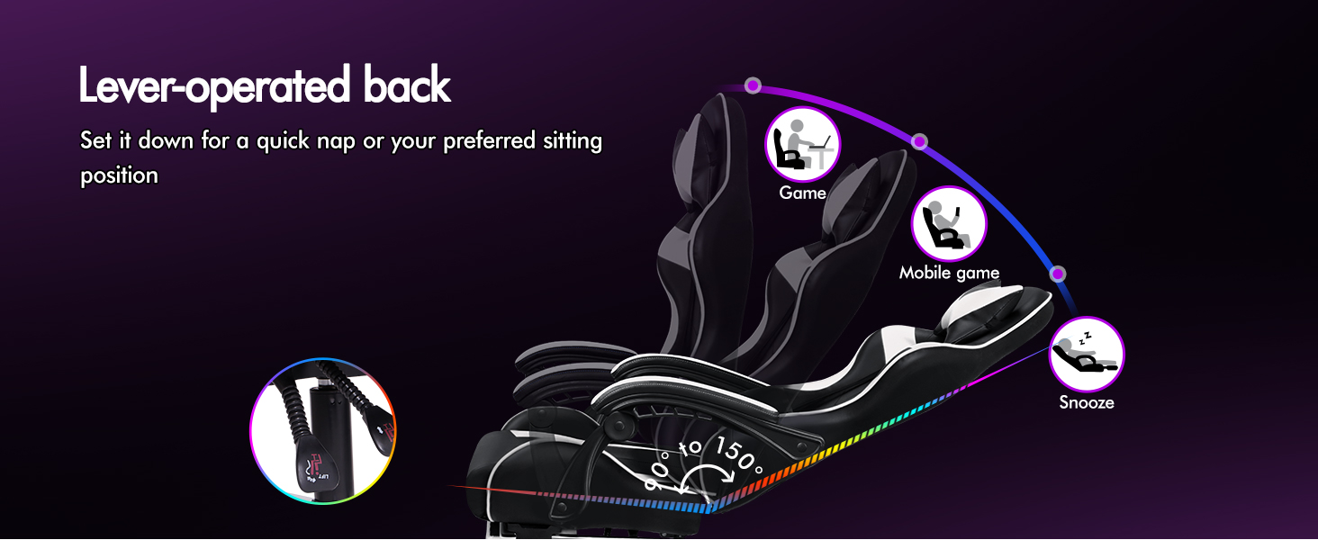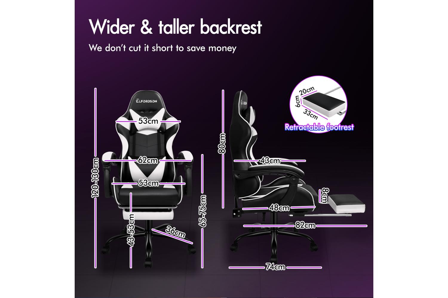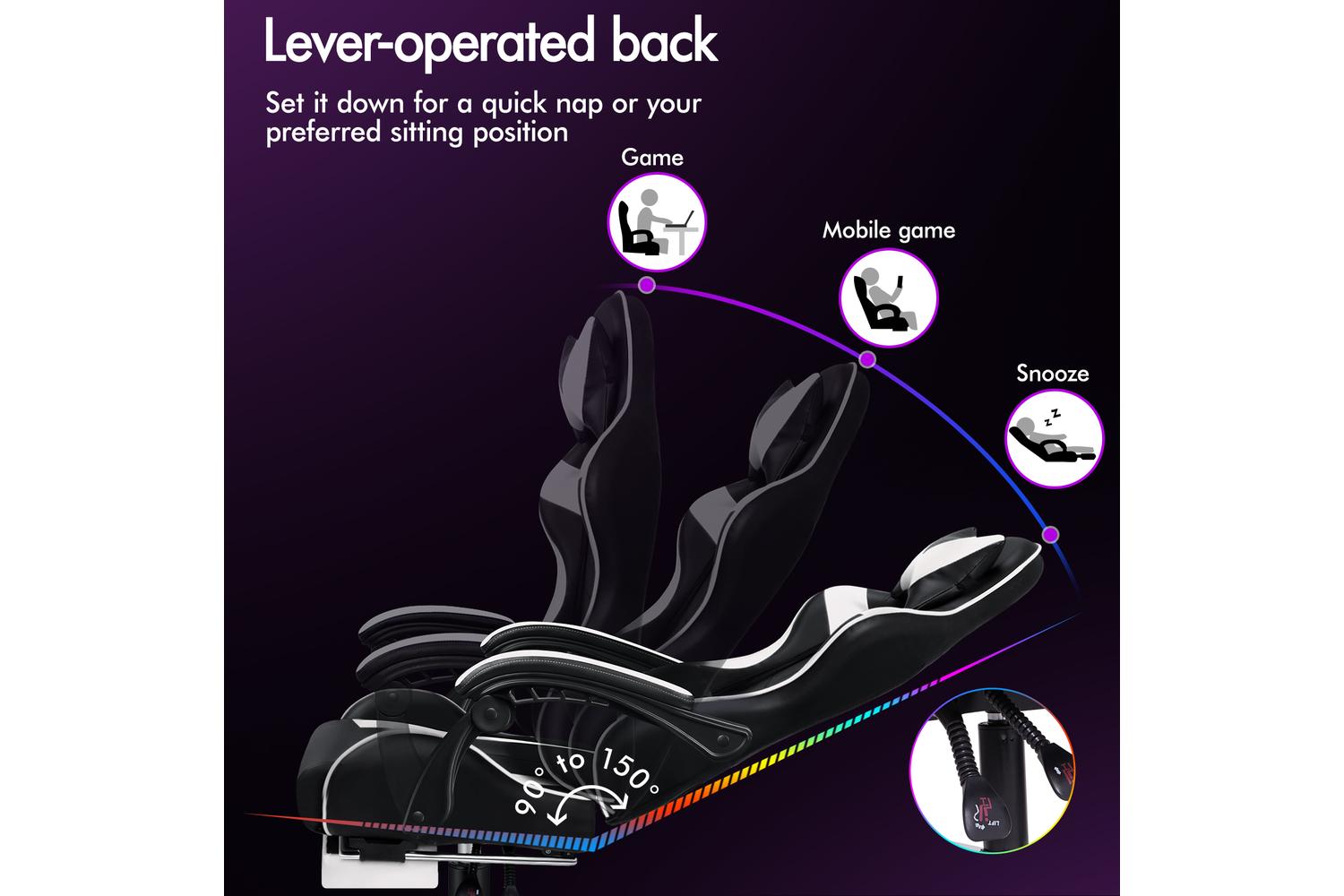 With backrest recliner between 90° and 150°, retractable padded footrest, 10cm seat height adjustments, and 360° swivel castors, this chair fits comfortably under most gaming desks or workstations.