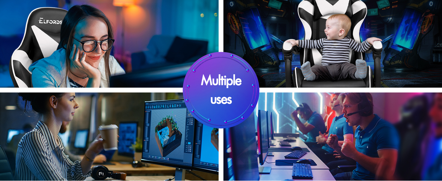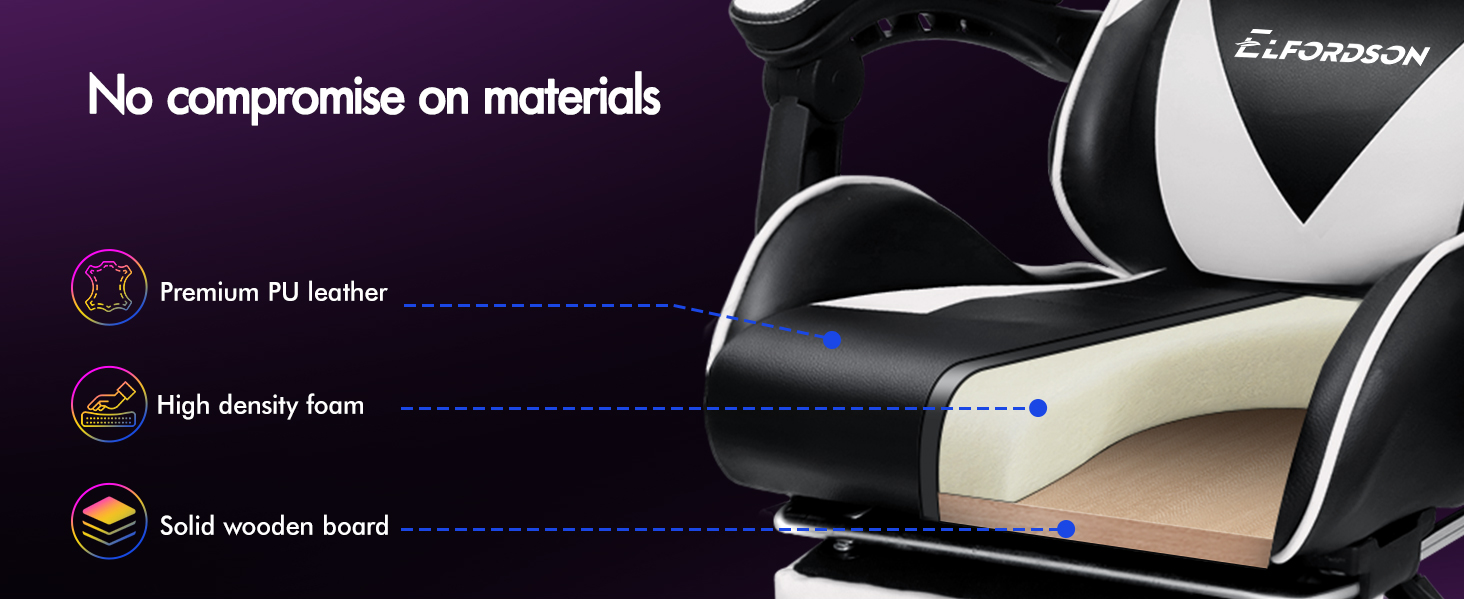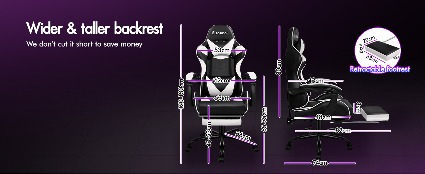 High-density foam padding on back and seat fully contours your body shape, built for all-day comfort. Adjustable and removable neck pillow, lumbar cushion adapts your sitting posture. 80cm high backrest ensures ultimate ease, even for those with a larger build.
