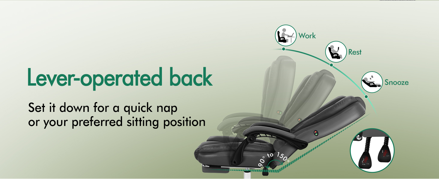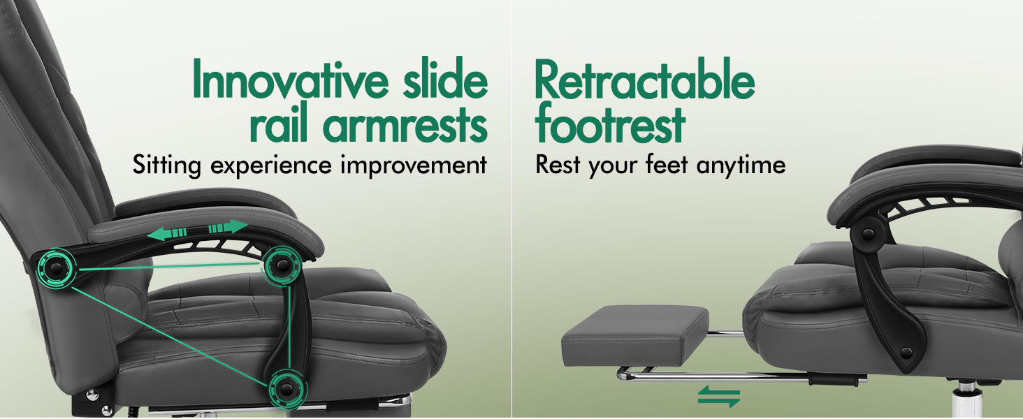 This executive chair reclines smoothly from 90° to 150°, meeting both work and relaxation needs. The retractable footrest enhances comfort for quick naps, while padded linkage armrests reduce strain and offer extra support during extended sitting. The seat height adjusts up to 10cm to suit your workstation, and 360° swivel casters ensure effortless mobility for multitasking. This chair adapts seamlessly to busy workspaces, home offices, or gaming areas.