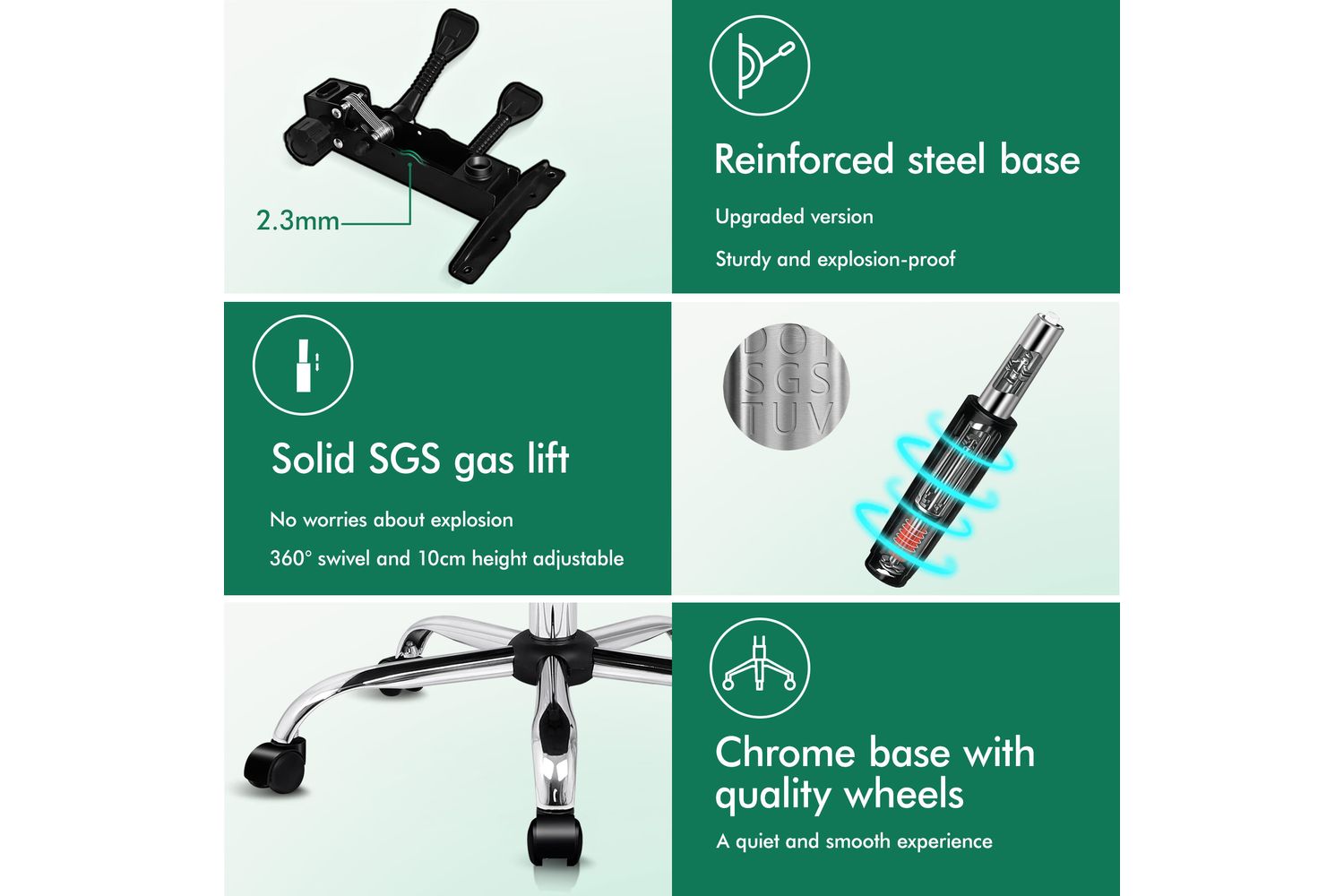 - A sturdy chrome base, complimented with the comfort of generously padded armrests and a footrest.