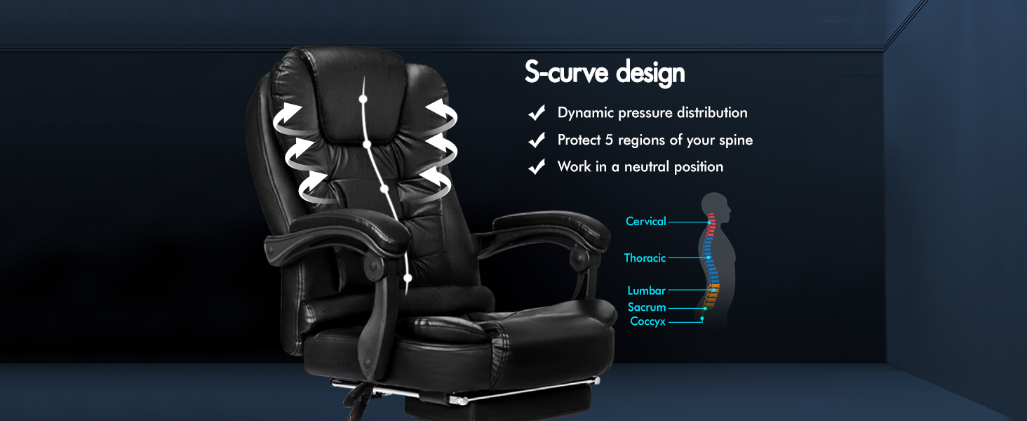 Relieve your back from the whole day's work. With 2 massage zone & 3 intensity modes, the professional office massaging chairs can ease your back from muscle pressure or back pain. The S-curved backrest design precisely connects 5 regions of the body spine. An exclusive comfy chair at work.