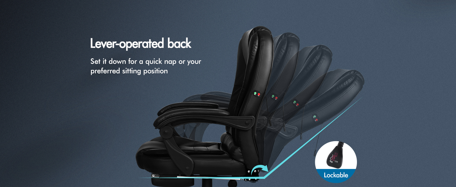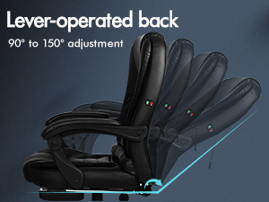 The reclining position is adjustable between 90-150°, which satisfied your work, relax and snooze needs. Adjust the seat up or down maximum by 10 cm to set your perfect seat height. The retractable footrest is designed for your relaxation needs. 360°swivel for multi-tasking scene convenience.