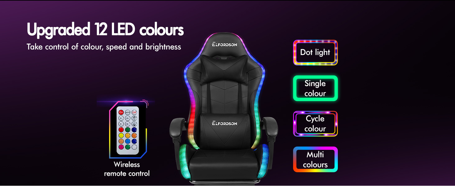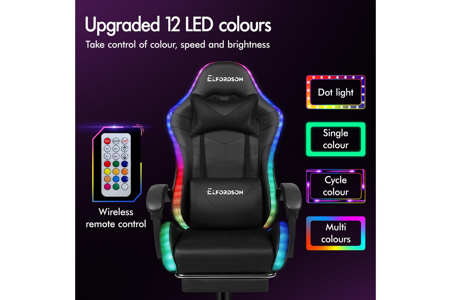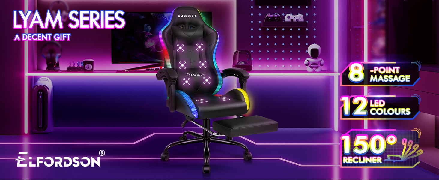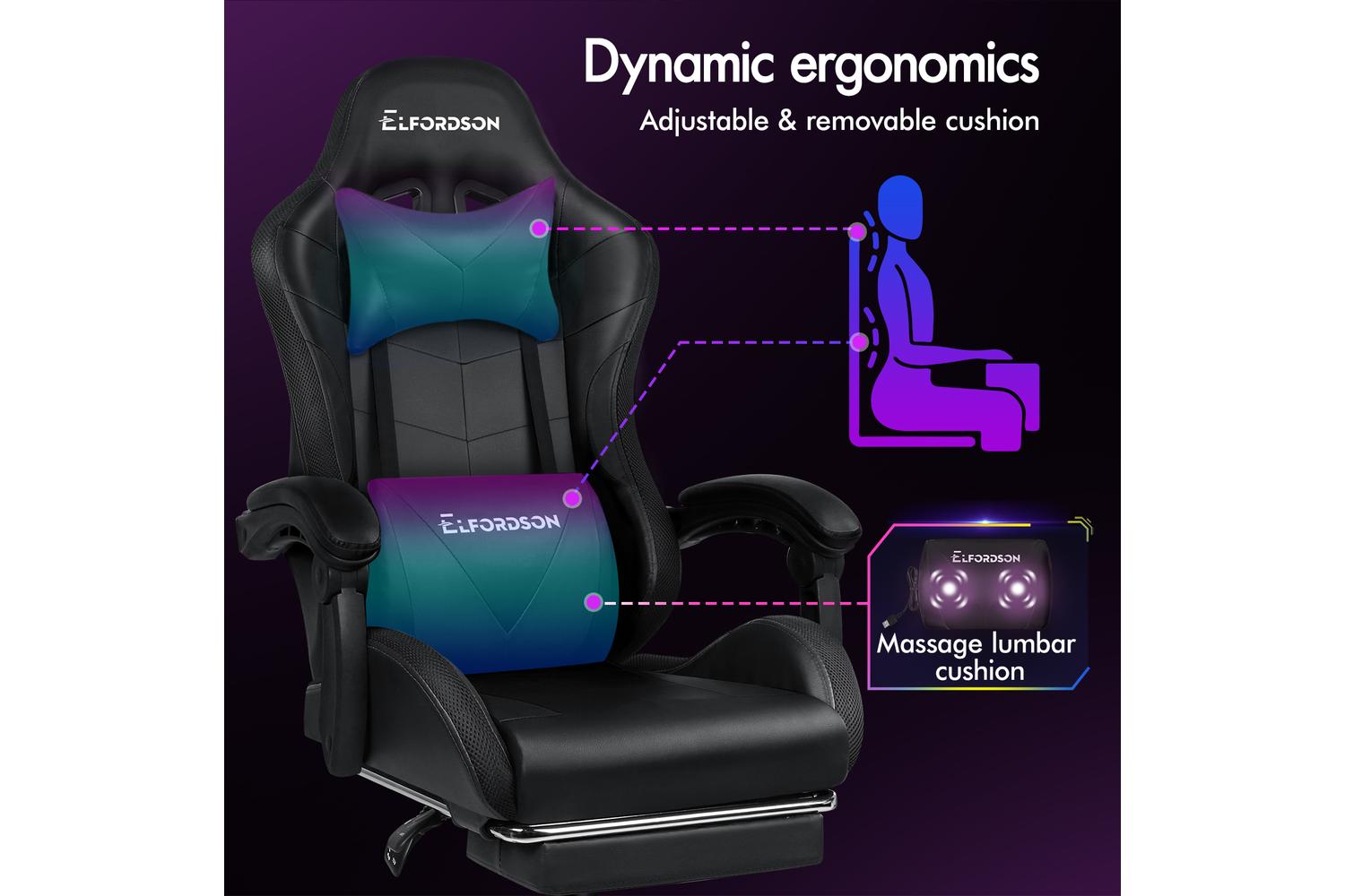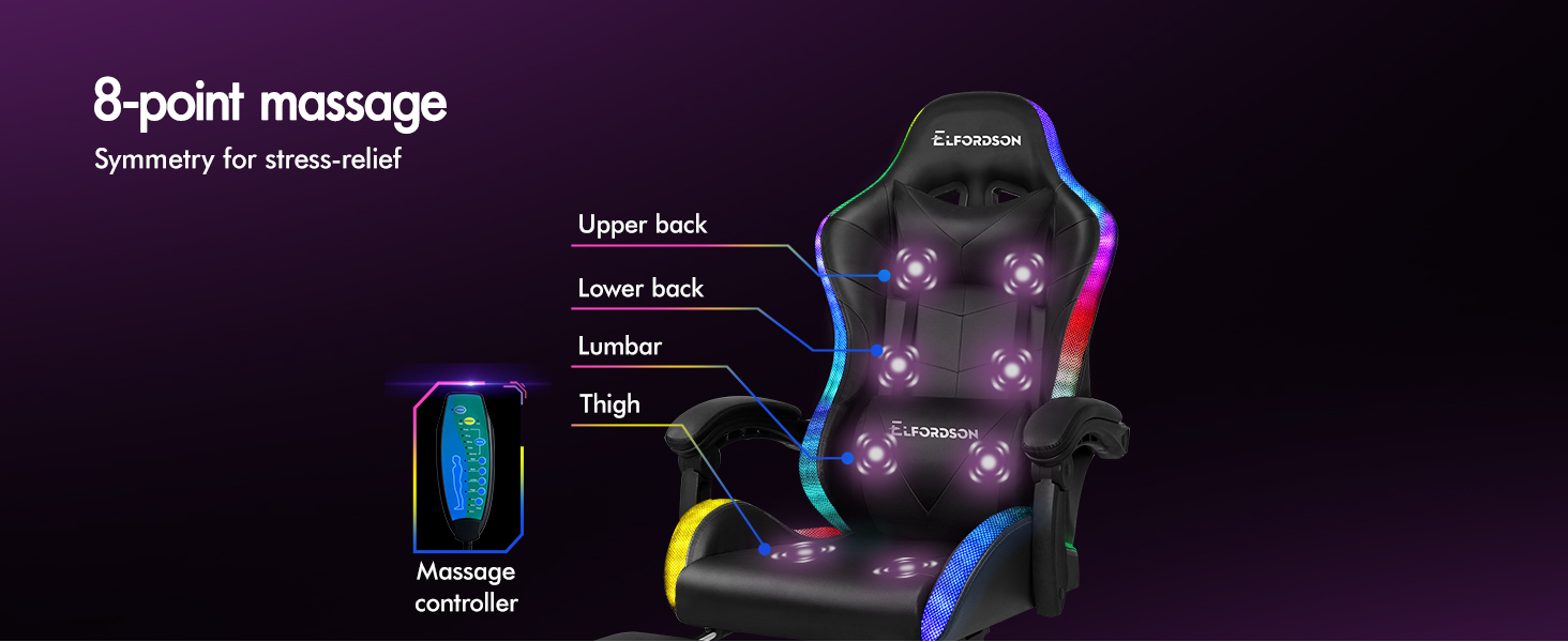 Elfordson 8-Point Massage Led Gaming Chair with Footrest | Black