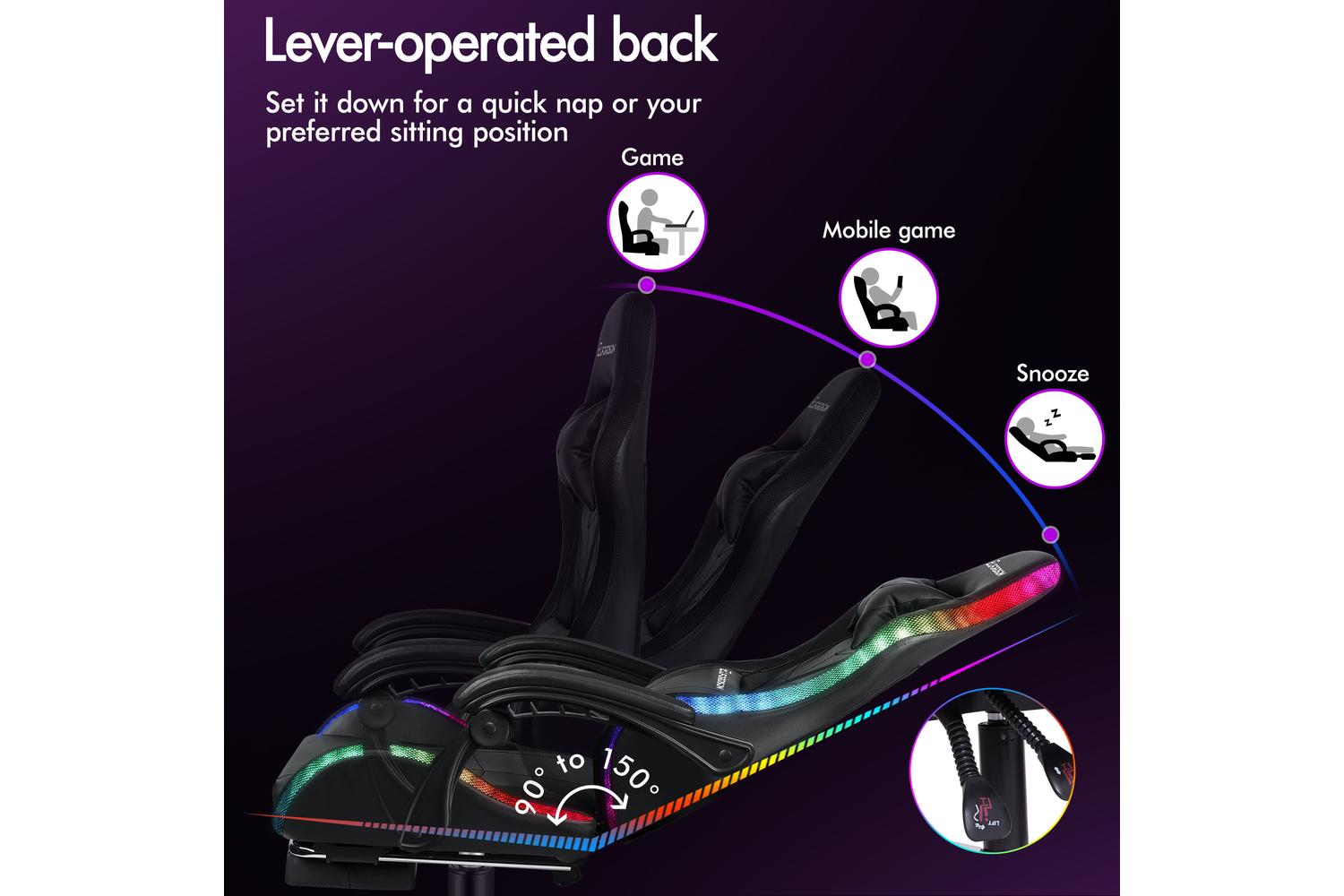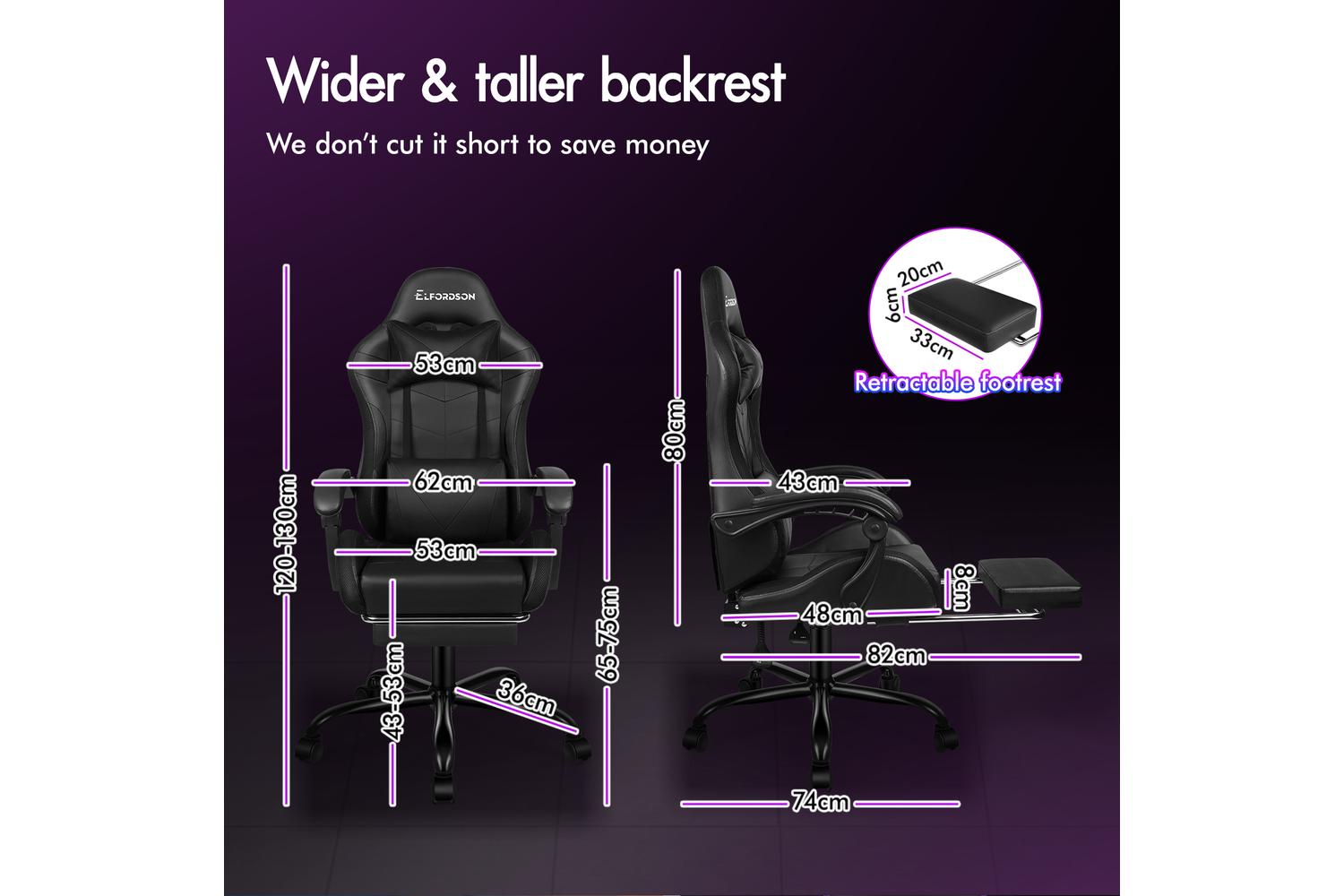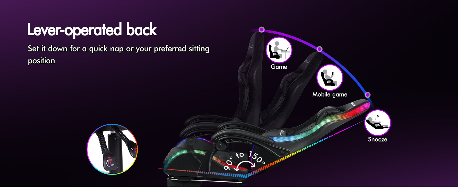 With backrest recliner between 90° and 150°, retractable padded footrest, 10cm seat height adjustments, and 360° swivel castors, this chair fits comfortably under most gaming desks or workstations.