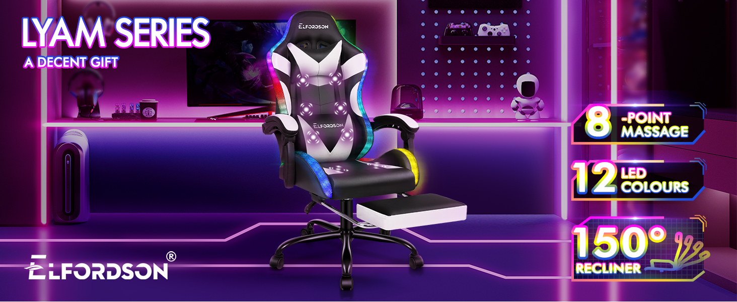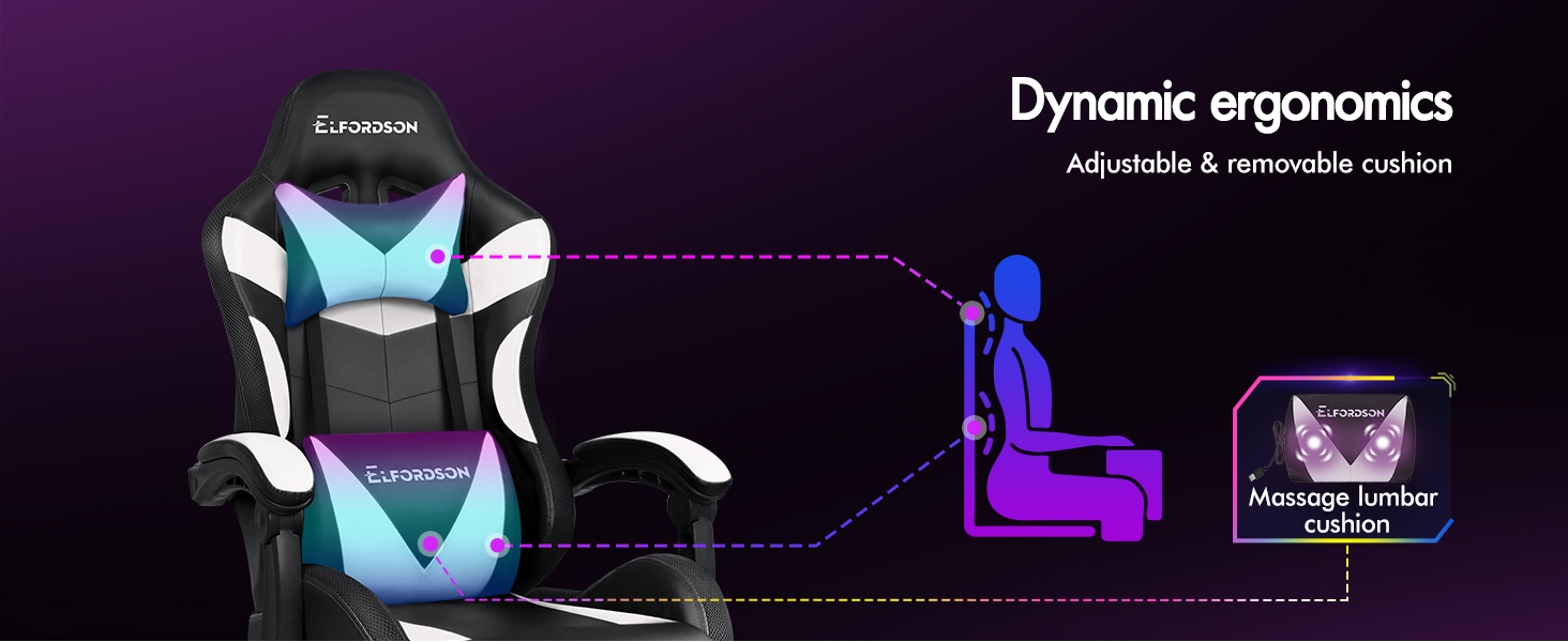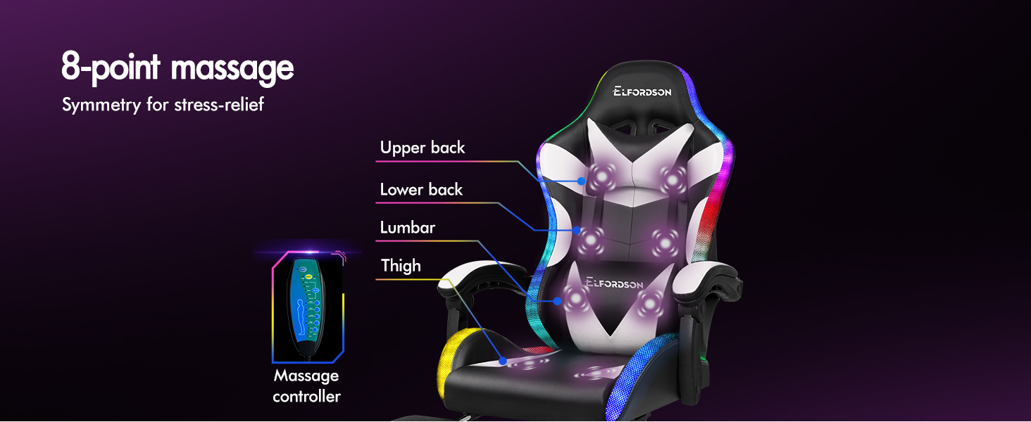 Elfordson 8-Point Massage Led Gaming Chair with Lumbar Cushion | White