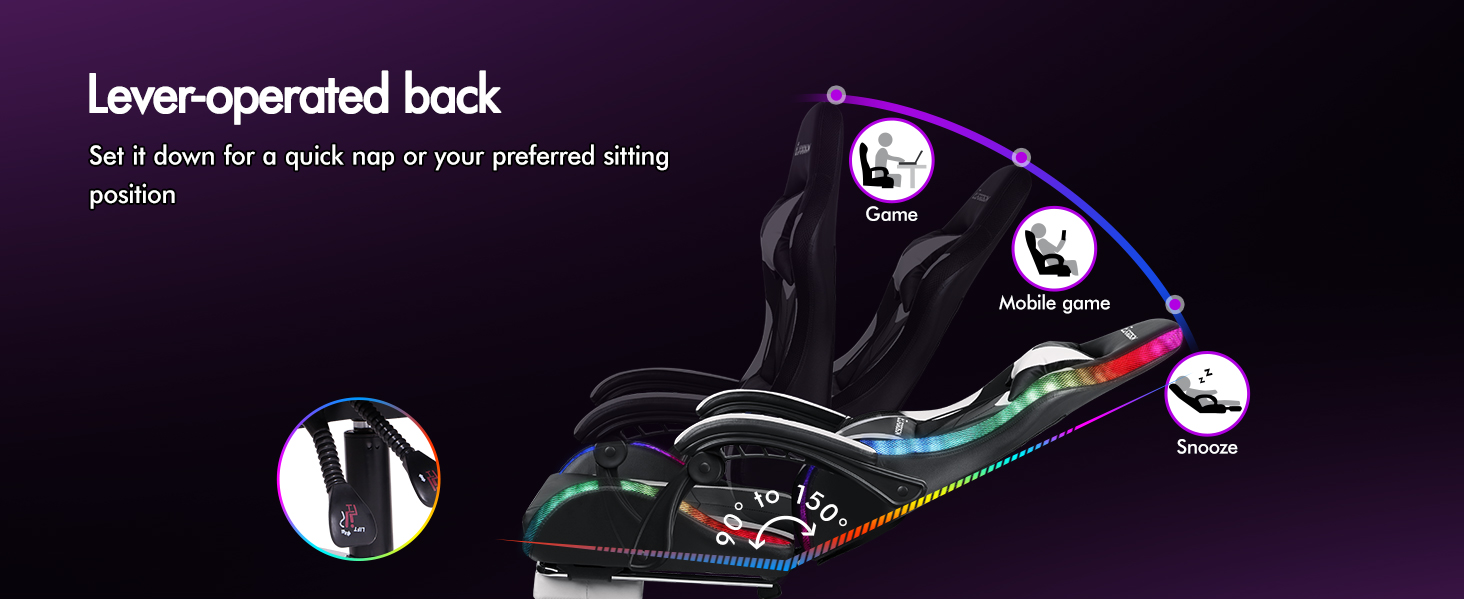 With backrest recliner between 90° and 150°, retractable padded footrest, 10cm seat height adjustments, and 360° swivel castors, this chair fits comfortably under most gaming desks or workstations.