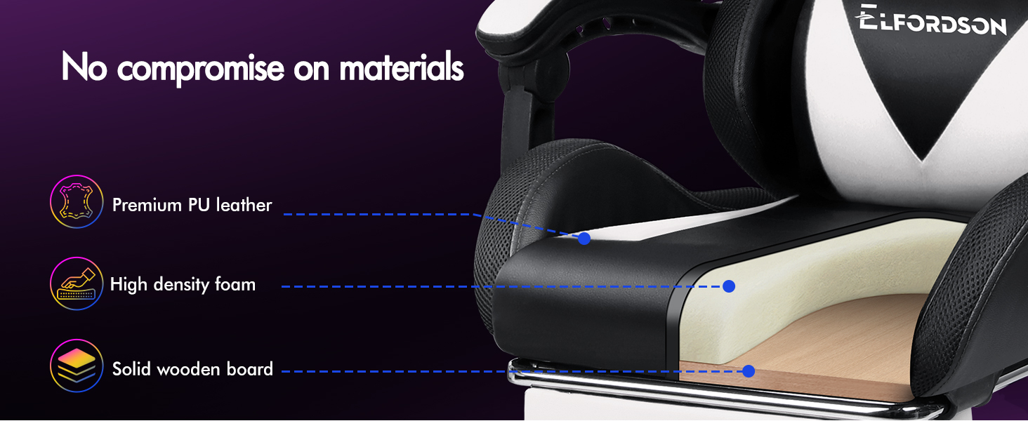 High-density foam padding on back and seat fully contours your body shape, built for all-day comfort. Adjustable and removable neck pillow, lumbar cushion adapts your sitting posture. 80cm high backrest ensures ultimate ease, even for those with a larger build.