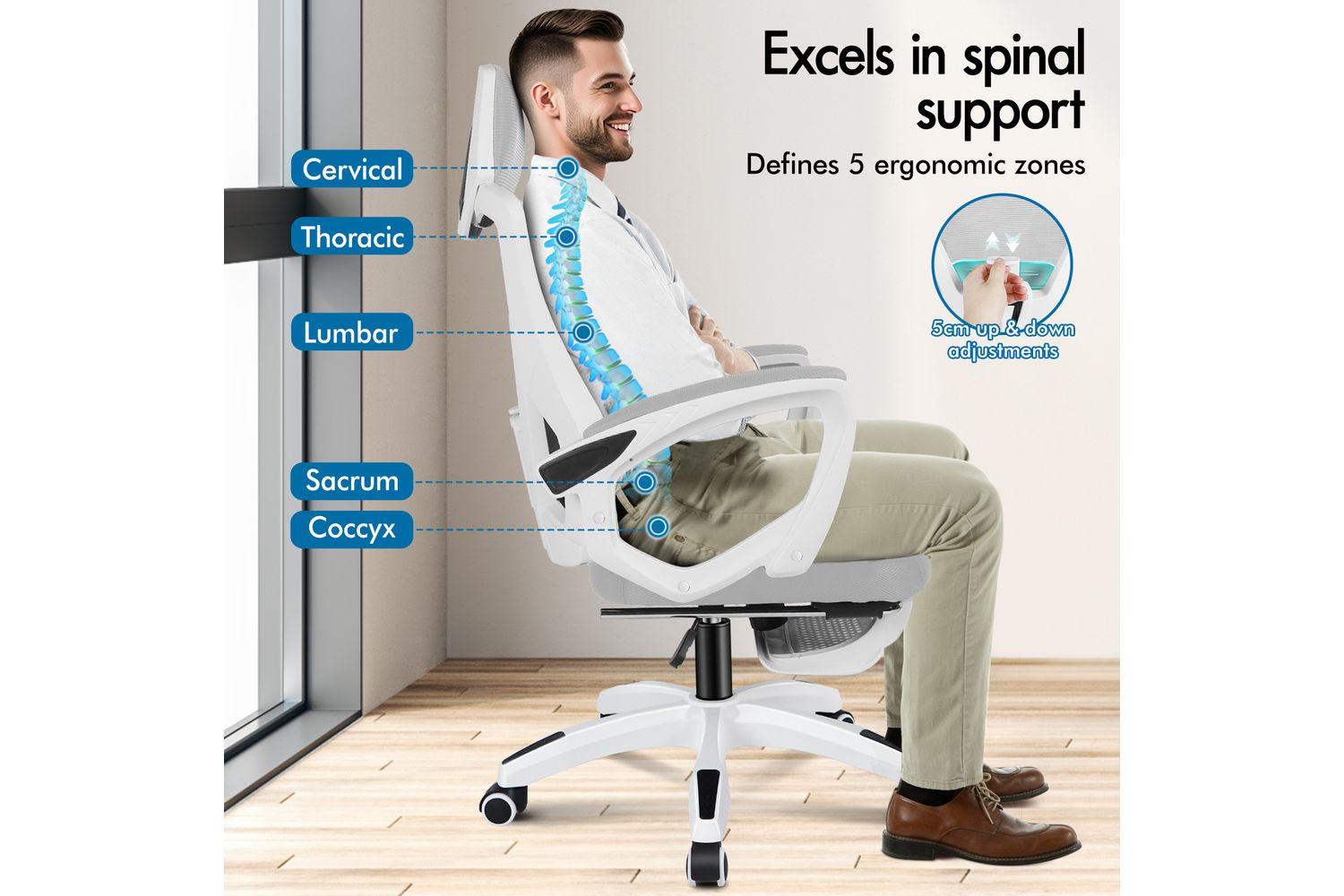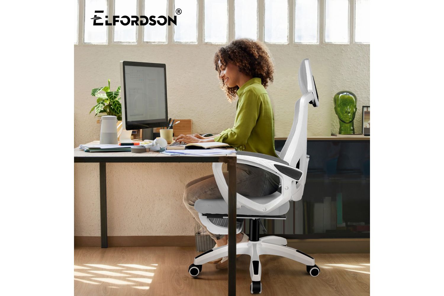 This ELFORDSON office chair features ergonomic high back design with adjustable lumbar support. It offers back and waist protection during prolonged sitting, helping to keep your spine aligned and prevent back pain.