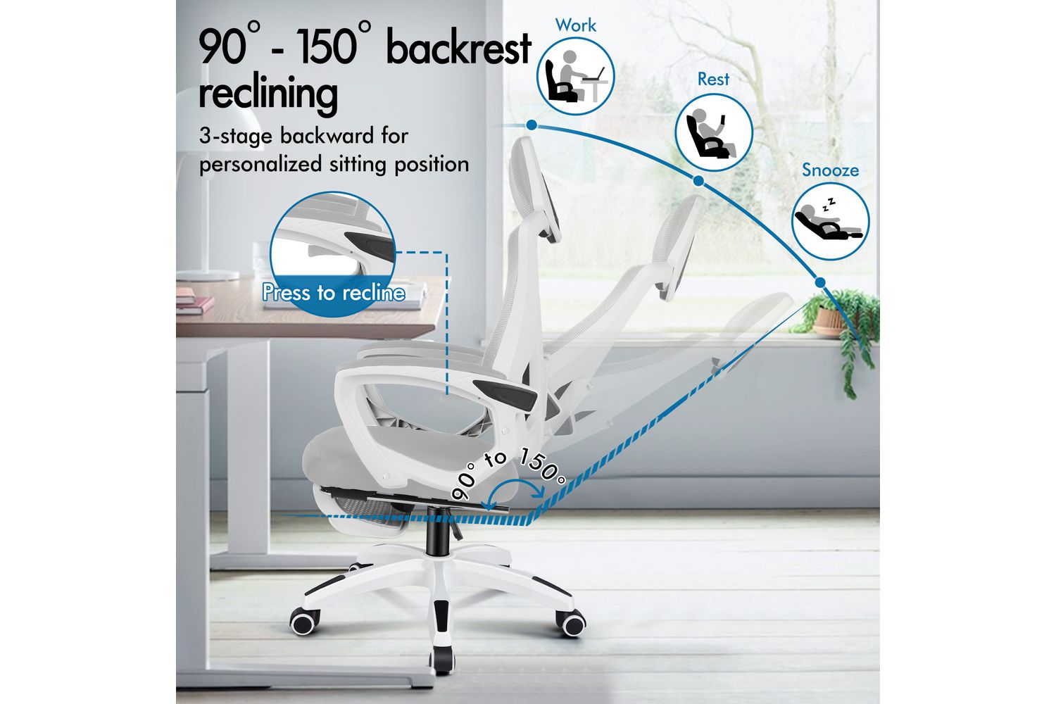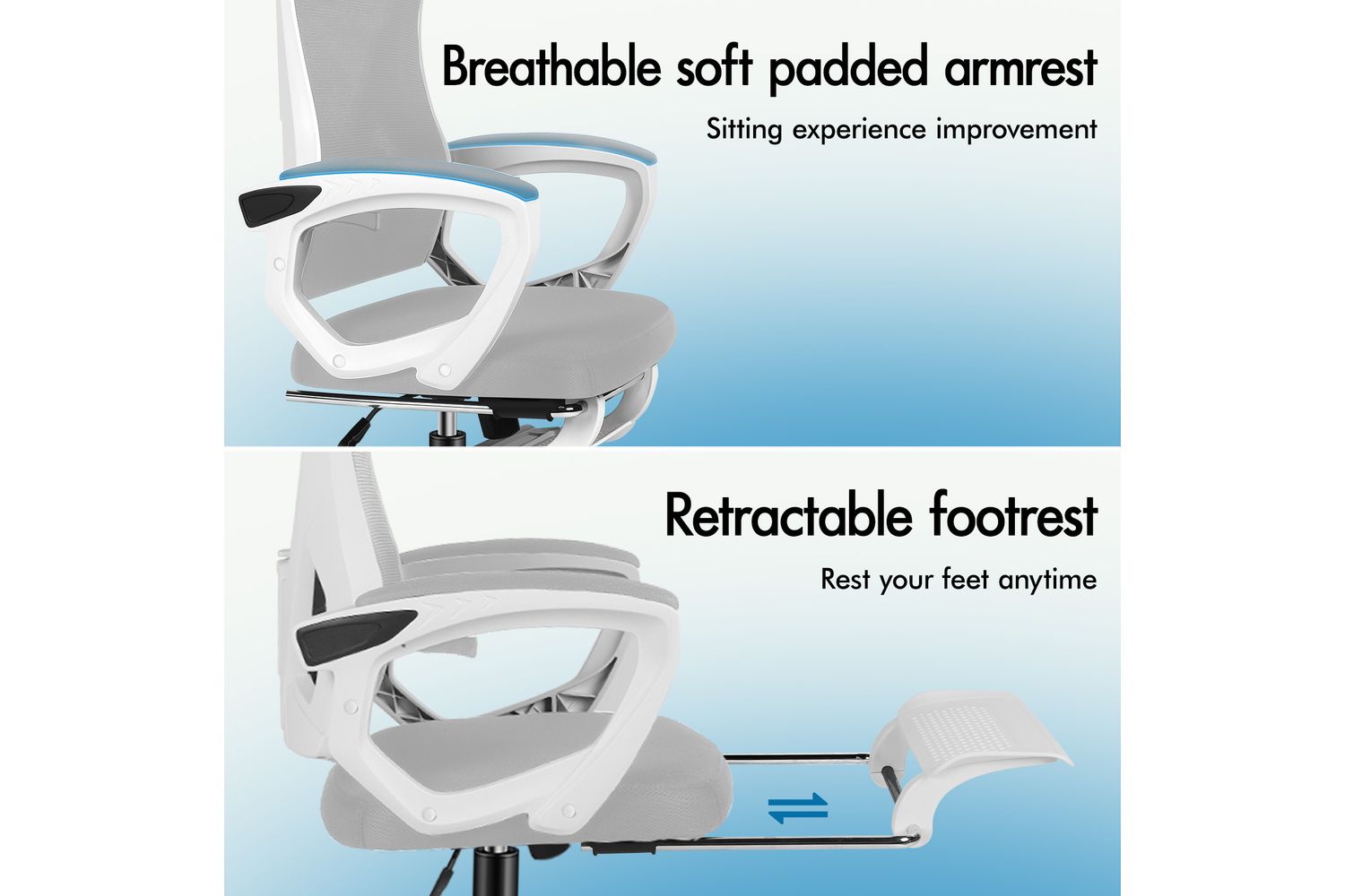 This desk chair reclines smoothly from 90° to 150°, meeting both work and relaxation needs. The retractable footrest enhances comfort for quick naps, while padded linkage armrests reduce strain and offer extra support during extended sitting. Rocking mode brings you more ease while resting.