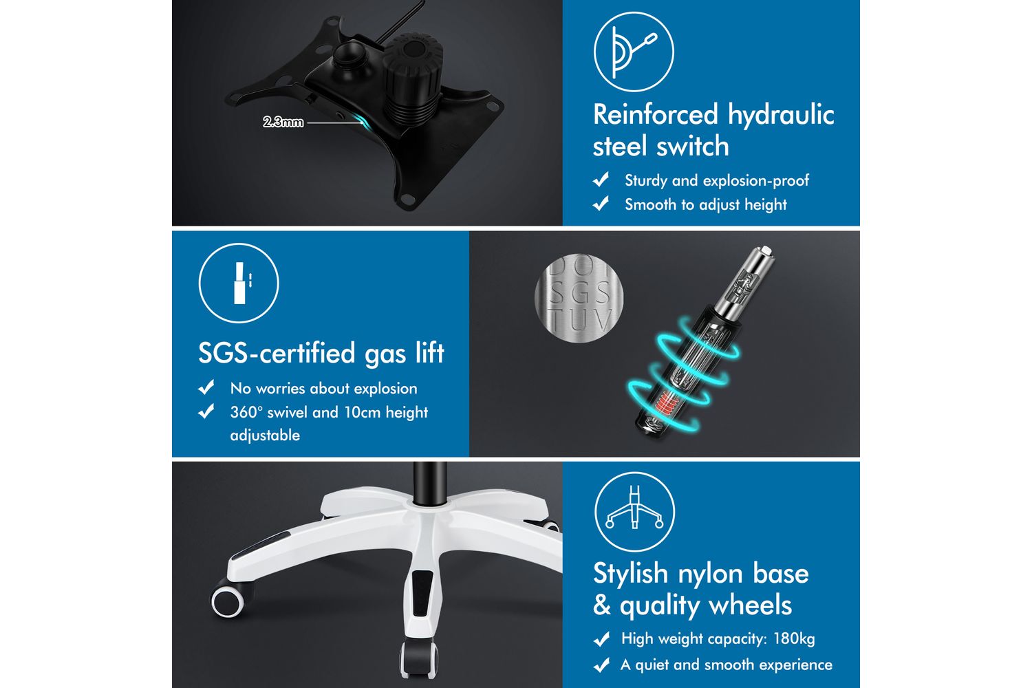The stylish base incorporates TUV-certified casters and an SGS-approved gas-lift system. Ultimate quality: no recycled foam, no shortened/narrowed backrests, and no thin seat foam.