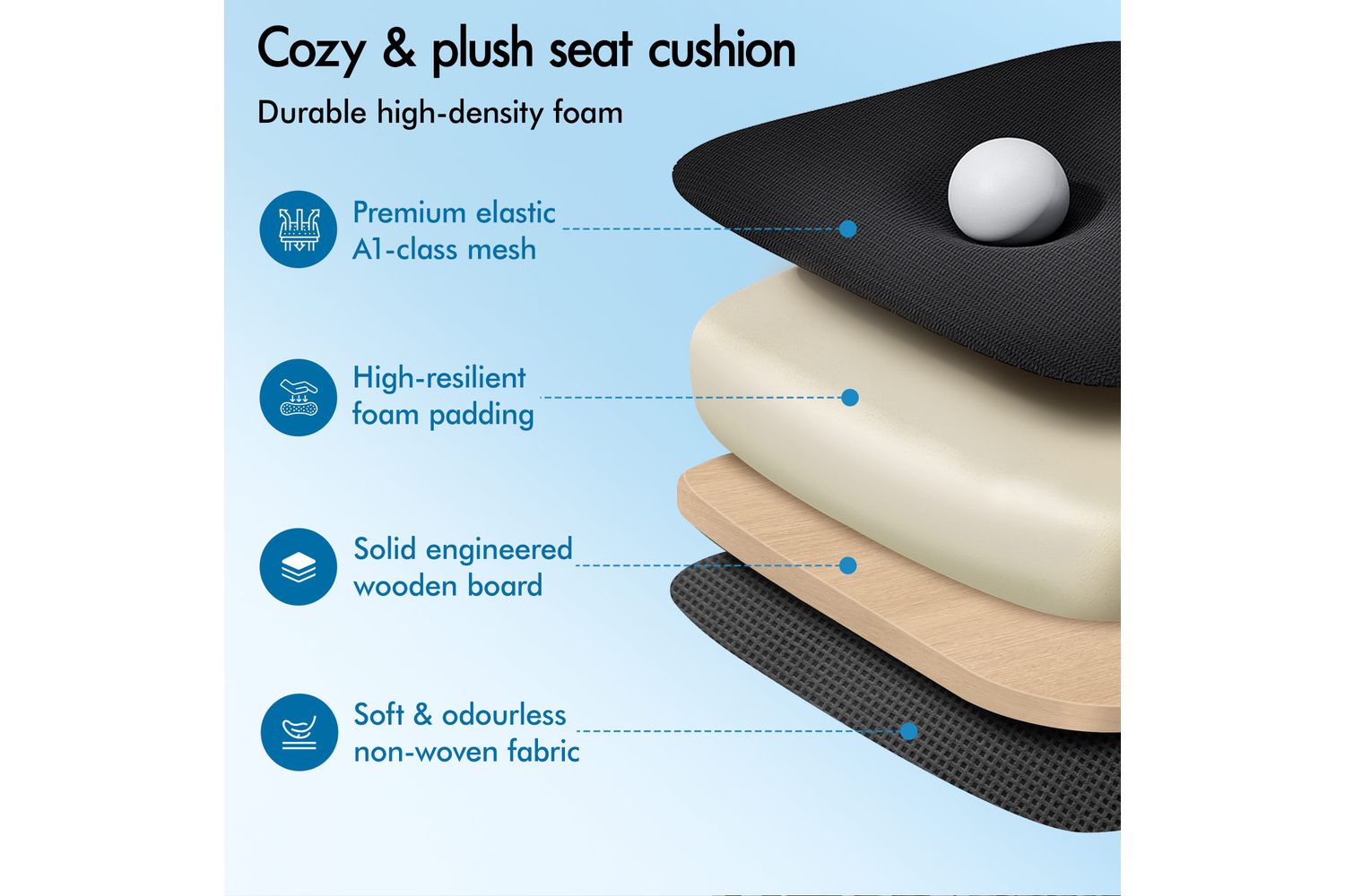 - Triple-layer seat: Mesh fabric + resilience foam + wooden board