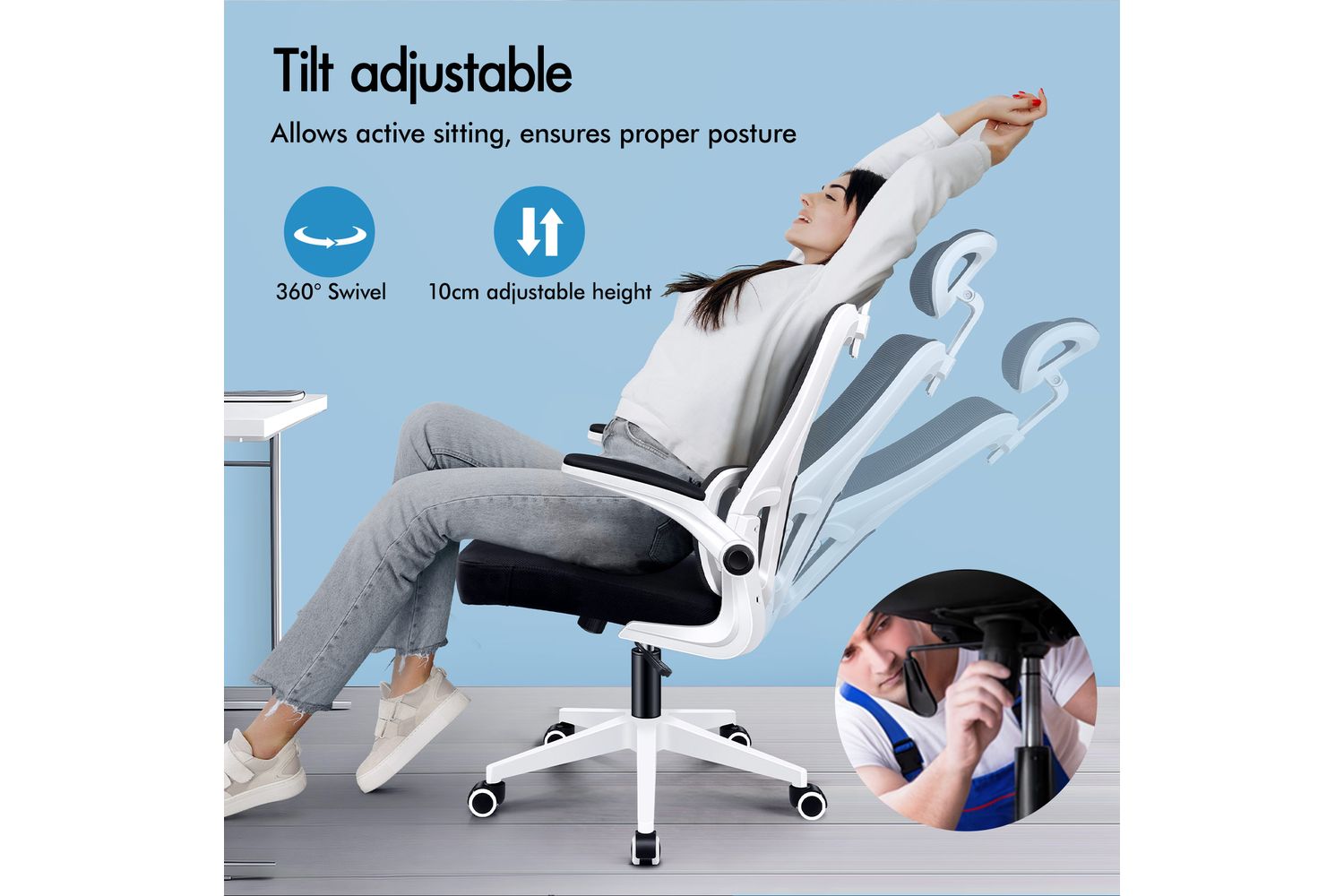 The armrests feature soft-touch sponge and mesh upholstery for comfort. The flip-up armrests and the 10cm seat height adjustment function allow you to store the chair neatly under your desk. An effortless space-saving design. For relaxation, simply turn the knob beneath the seat to enjoy 90°-120° free rocking.