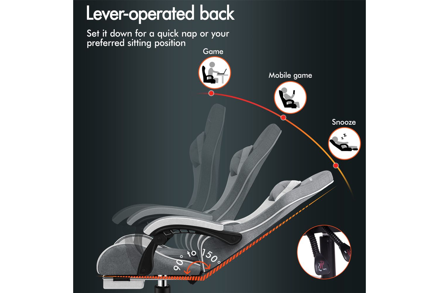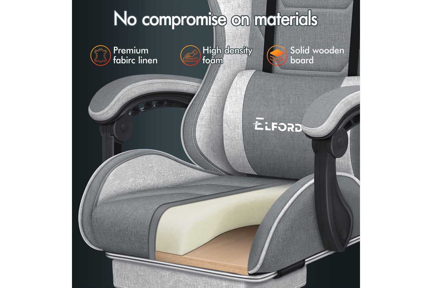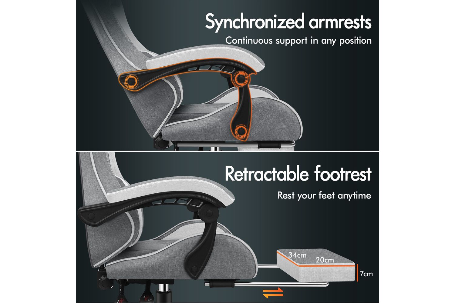 Our gaming chair boasts a contemporary design, swathed in luxuriously breathable Fabric Linen and generously filled with foam paddings in a car-seat grade. To ensure a homely feel, it is elegantly finished in a spectacular Light Grey colour. Its uniquely adjustable components – detachable lumbar and neck cushions - ensure you are well-rested and agile for your gaming or business tasks.
