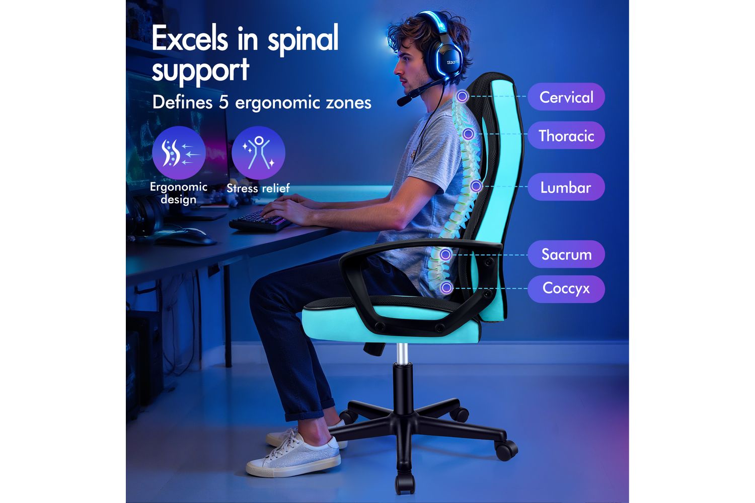Wrapped in premium PU leather with a breathable mesh panel, this chair lends an air of elegance whilst ensuring you stay cool during intense gaming sessions or long work shifts. The mesh material promotes airflow, maintaining a comfortable temperature no matter how heated the game gets or how high the work pressure increases. This ergonomic gaming chair quite literally has your back with its S-curve design that contours to your body's natural shape, fully supporting your spine and relieving pressure from long hours of sitting.