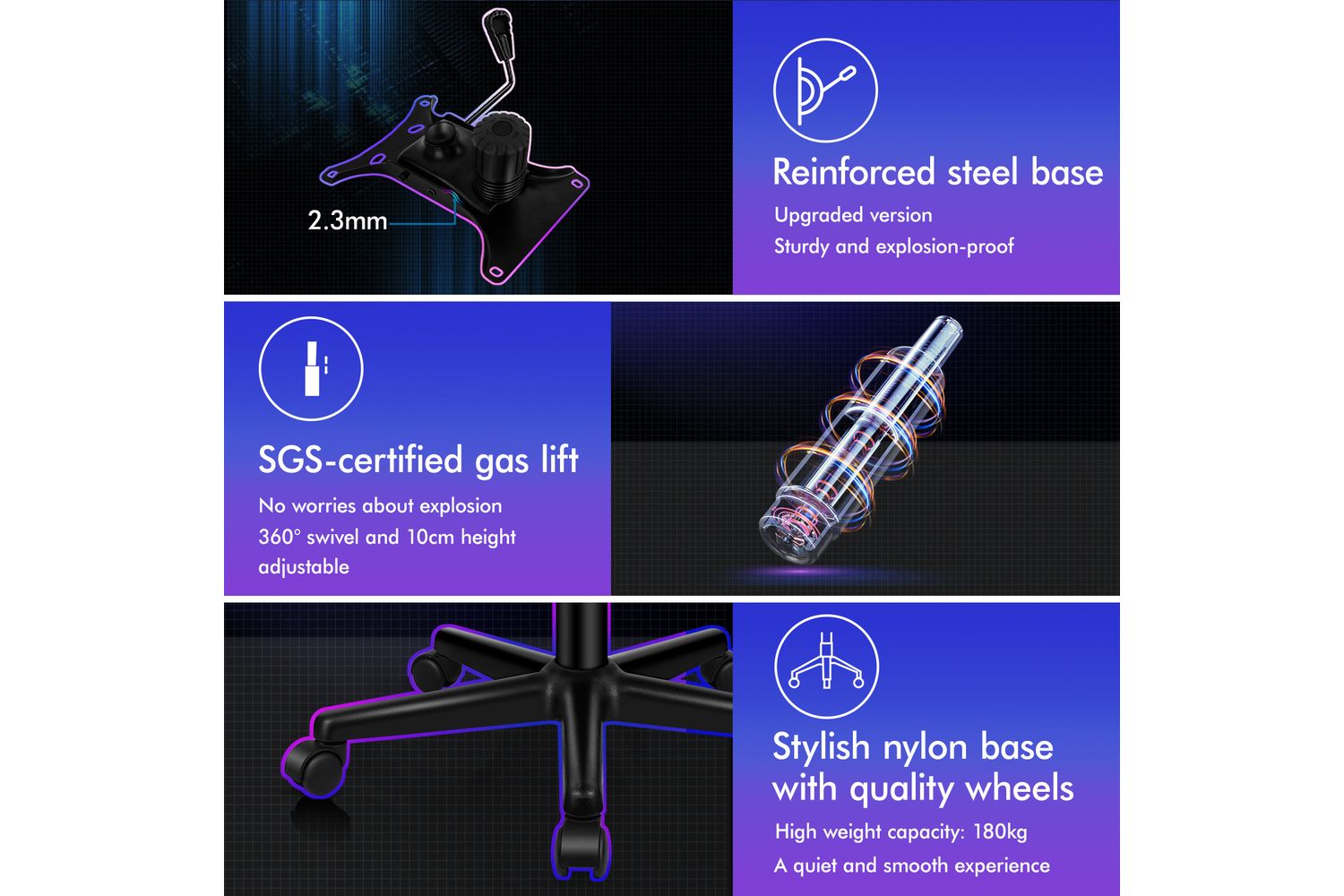 Operating this multi-functional chair is incredibly smooth and effortless, thanks to its full 360-degrees swivel and adjustable tilt function. This way, movement becomes an integral part of your gaming or work experience and not a hindrance. Officially certified and tested by TÜV, Intertek, BIFMA, and SGS, this chair meets the high standards of safety and performance, delivering consistent, reliable performance without cutbacks on quality or safety.