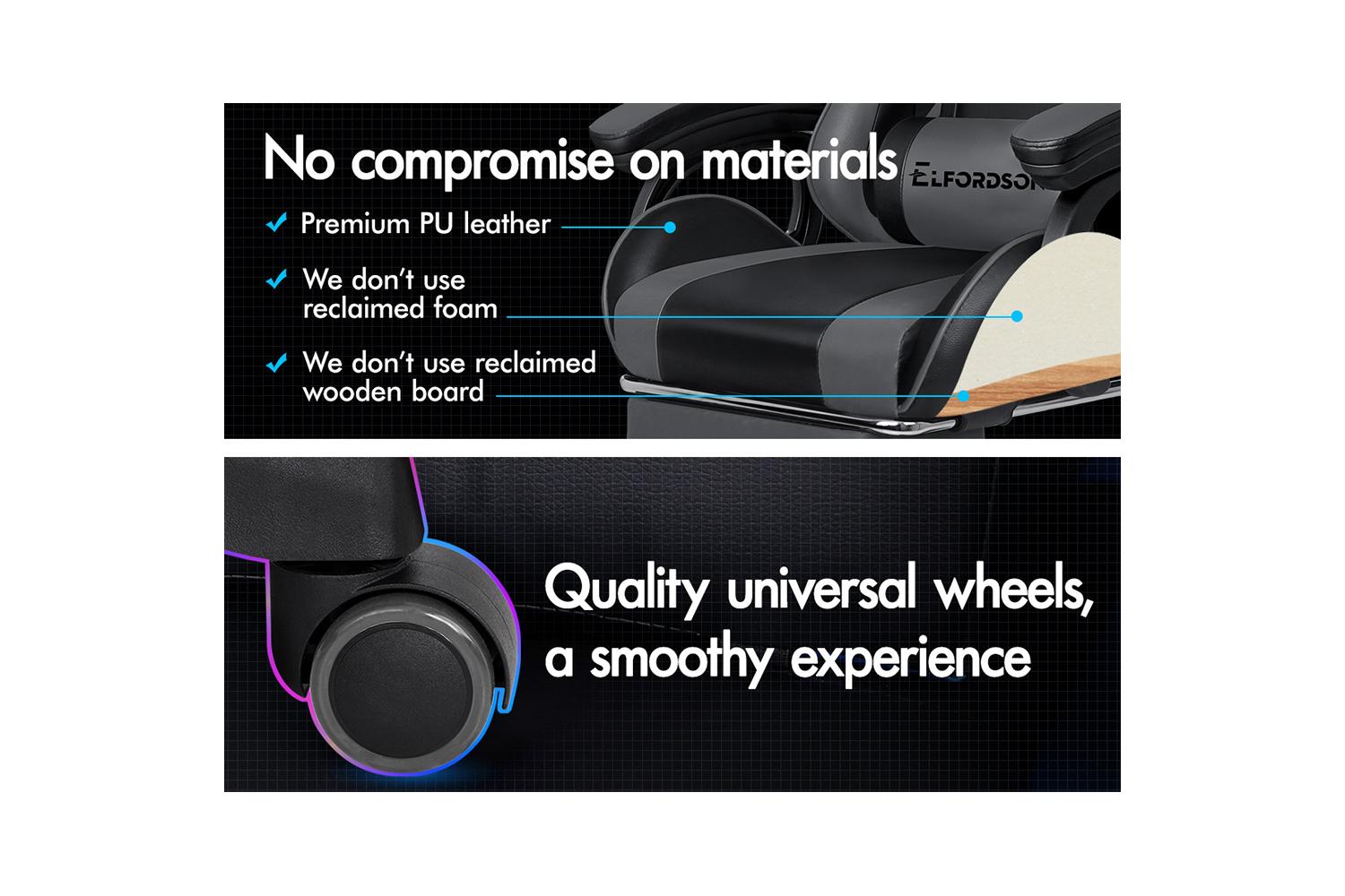 A stylish nylon base with TUV certified casters, Intertek approved PU leather, SGS approved Gas-Lift system and tilt function, delivering absolute five star luxury. And unlike some other sellers, we have no compromise on materials used. We guarantee that no cycled foams are used, no backrest is cut short or narrow to save money, and no seat foam is cut thin to save cost.