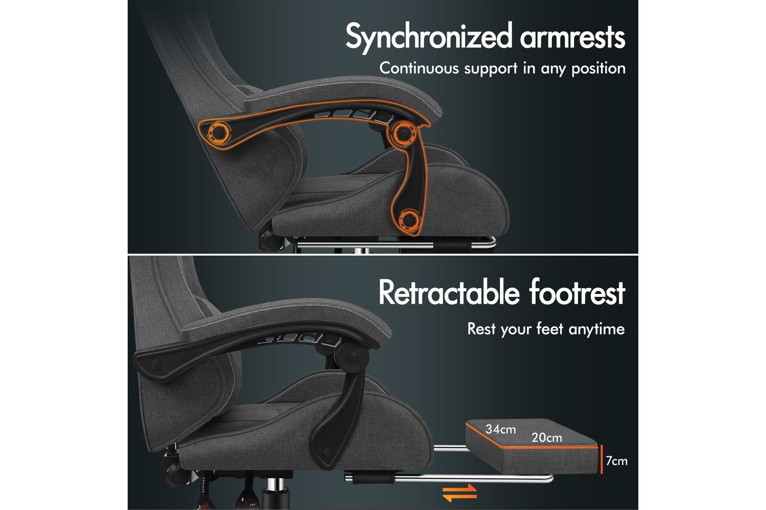 With 10cm of height adjustment, this gaming chair comfortably accommodates children, teenagers, and adults. The linkage armrests move along with the reclining backrest (90°-150°), ensuring continuous arm support whether gaming, working, or resting. Retractable footrest enhances relaxation, while 360° swivel and multi-directional silent casters enable smooth movement. This PC chair allows you to move effortlessly at home, office, or e-sports playroom.
