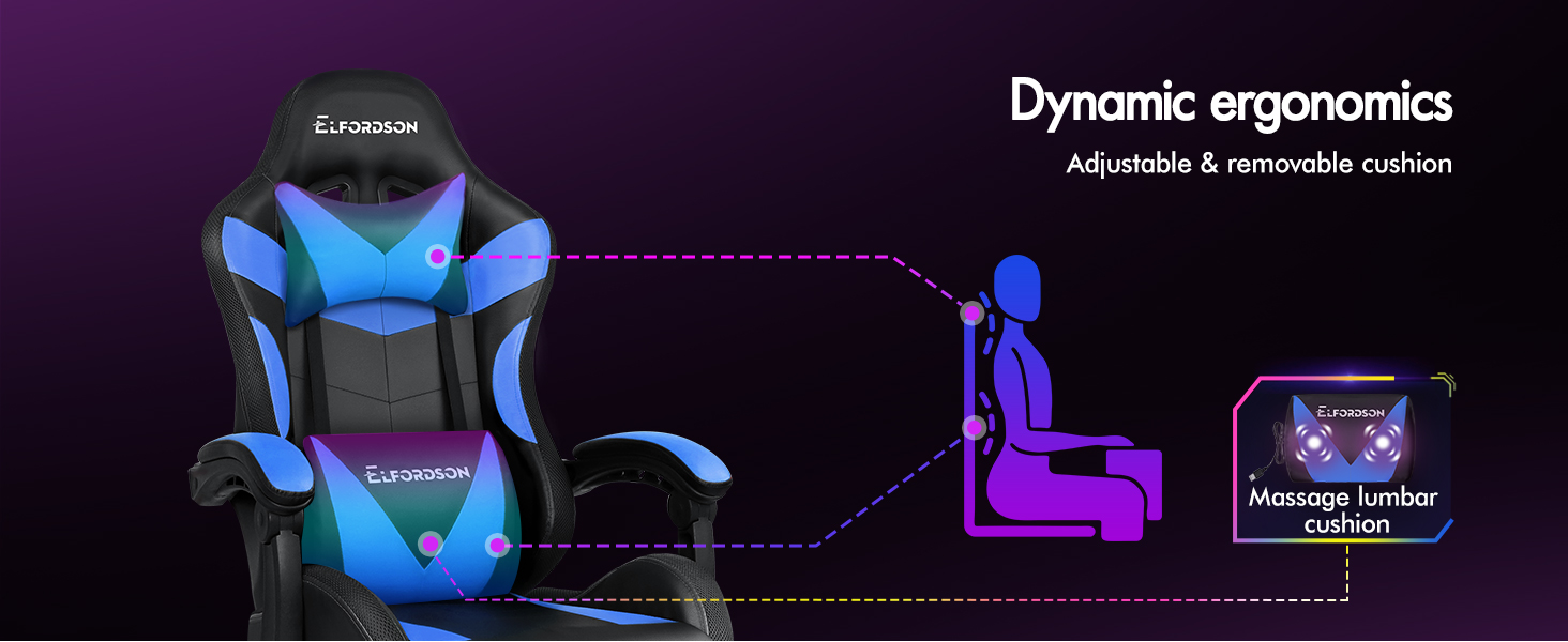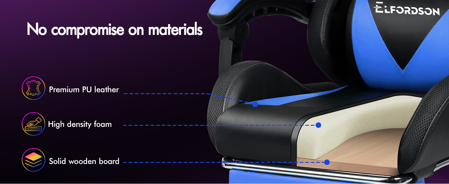 High-density foam padding on back and seat fully contours your body shape, built for all-day comfort. Adjustable and removable neck pillow, lumbar cushion adapts your sitting posture. 80cm high backrest ensures ultimate ease, even for those with a larger build.