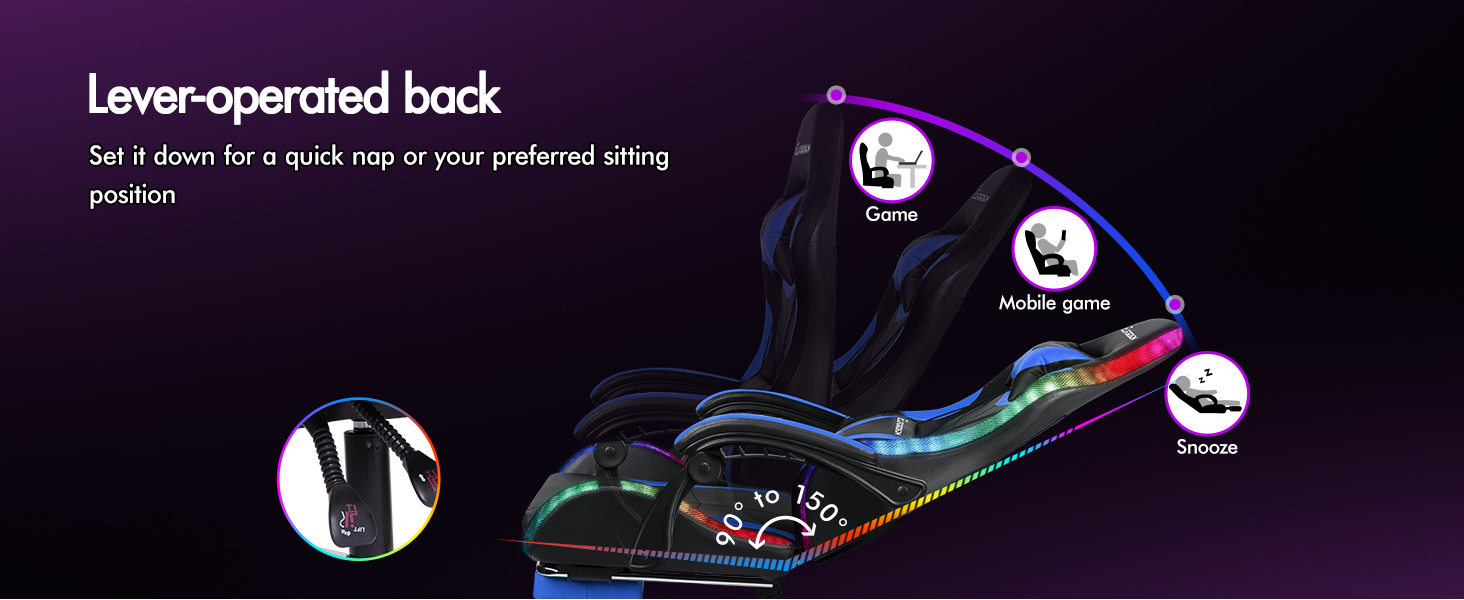 With backrest recliner between 90° and 150°, retractable padded footrest, 10cm seat height adjustments, and 360° swivel castors, this chair fits comfortably under most gaming desks or workstations.