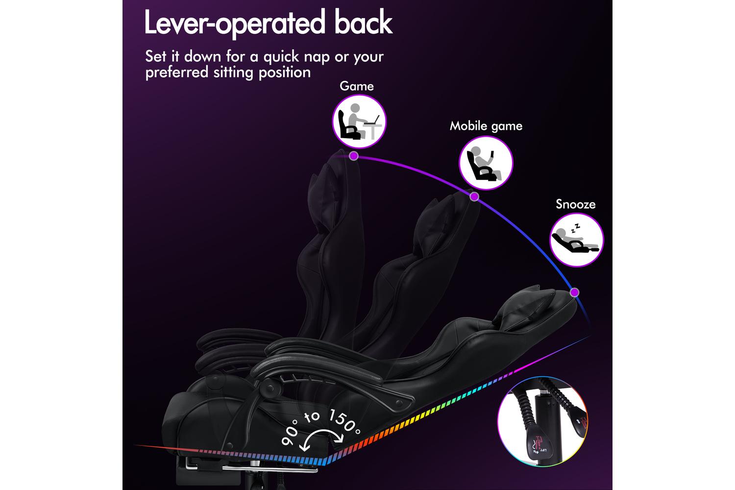 With backrest recliner between 90° and 150°, retractable padded footrest, 10cm seat height adjustments, and 360° swivel castors, this chair fits comfortably under most gaming desks or workstations.