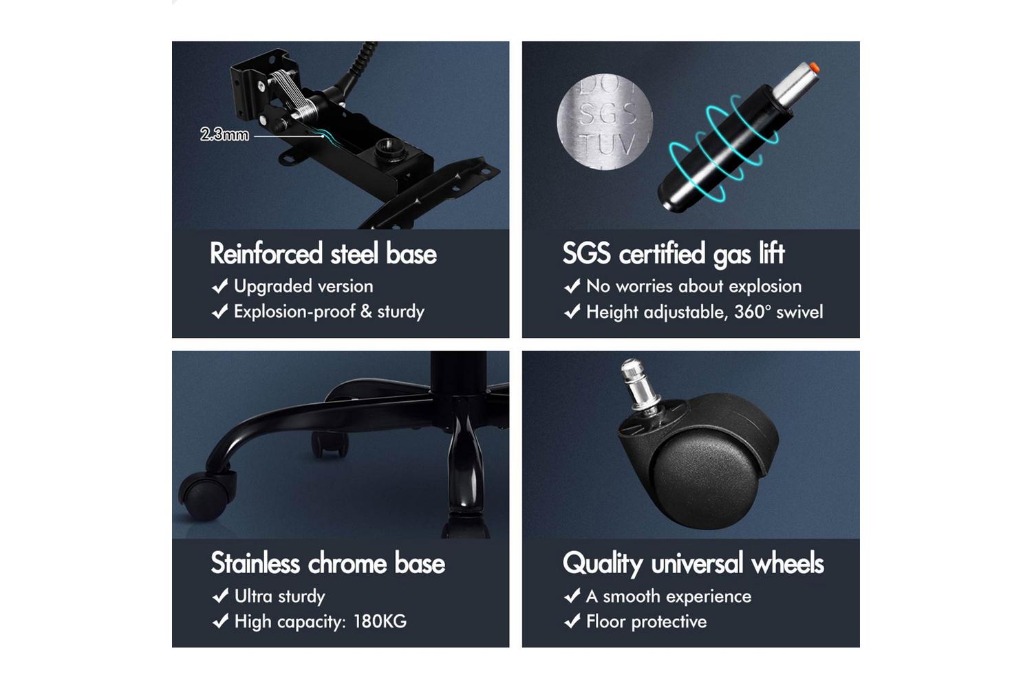 It features a sturdy chrome base with up to 150 degree back recline adjustment and 360 degree swivel, you can lock the position of reclination as you wish. Upholstery crafted from premium PU leather and generous foam paddings ensures optimal durability and easy cleaning.