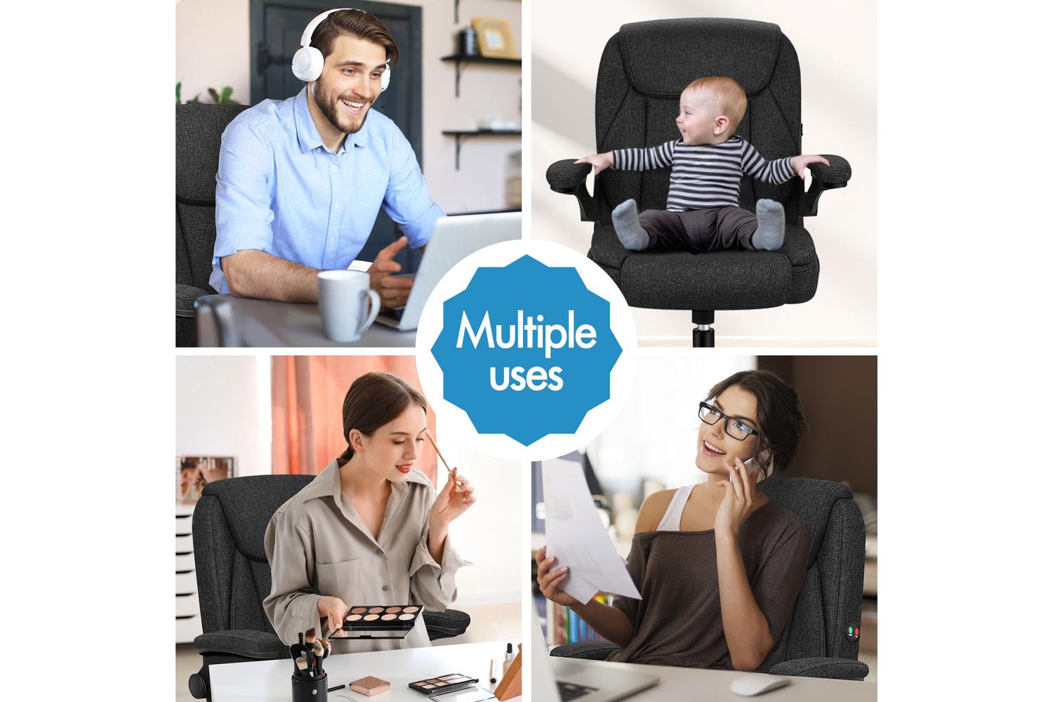 Elfordson sturdy chrome base with tilt adjustment and 360-degree swivel, accompanied by a SGS certified gas lift providing a 10cm height adjustment, ensures durability and ease of use. The upholstery crafted from premium Linen Fabric with generous foam padding not only ensures optimal durability but also makes it easy to clean.