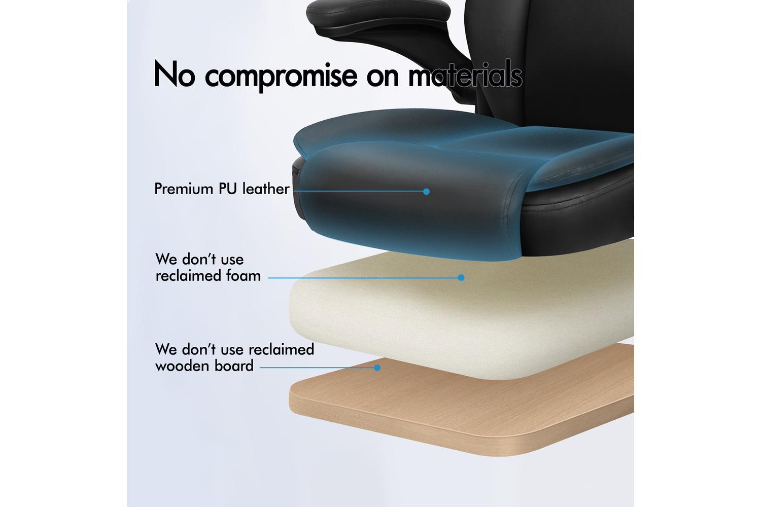 Unlike some other sellers, we have no compromise on materials used. We guarantee that no cycled foams are used, no backrest is cut short or narrow to save money, and no seat foam is cut thin to save cost.