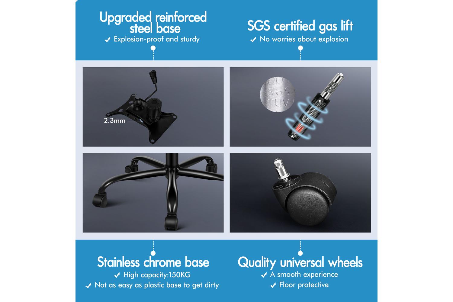 Elfordson sturdy chrome base with tilt adjustment and 360-degree swivel, accompanied by a SGS certified gas lift providing a 10cm height adjustment, ensures durability and ease of use. The upholstery crafted from premium PU leather with generous foam padding not only ensures optimal durability but also makes it easy to clean.