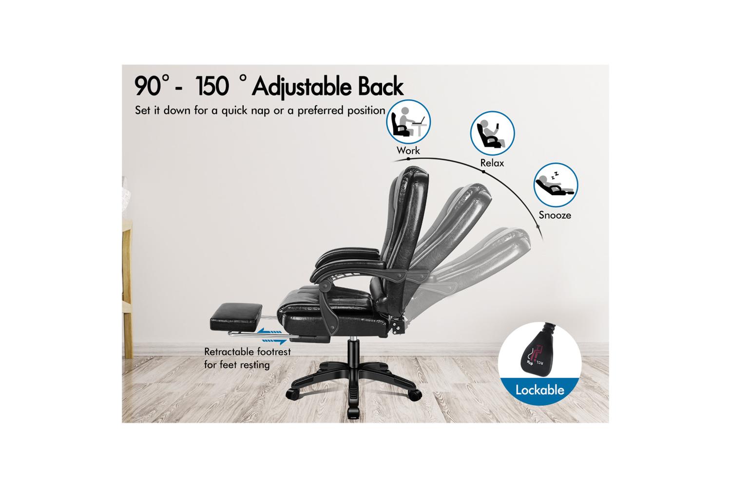 The chair features 150 degree back recline adjustment and 360 degree swivel. You can lock the position of reclination as you wish. Combined with retractable padded footrest, it suits your personalized positions while sitting, sleeping or playing games. An elite in quality and design, your solution to true comfort.