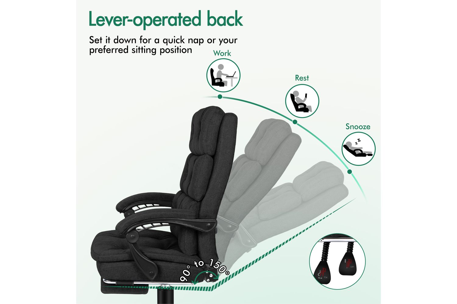 • Up to 150 degree back recline adjustment