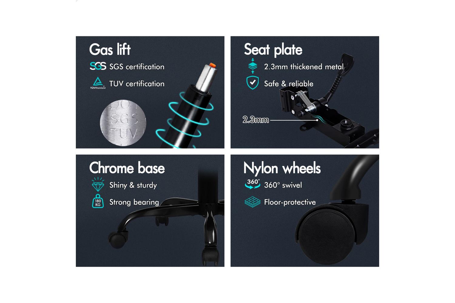 Constructed with a heavy duty chrome base, TUV certified casters and SGS approved gas-lift system, the chair is endurable. You don't have to worry about tipping over or exploding. The 360 degree swivel and height adjustable seat adds more convenience, delivering absolute five star luxury.