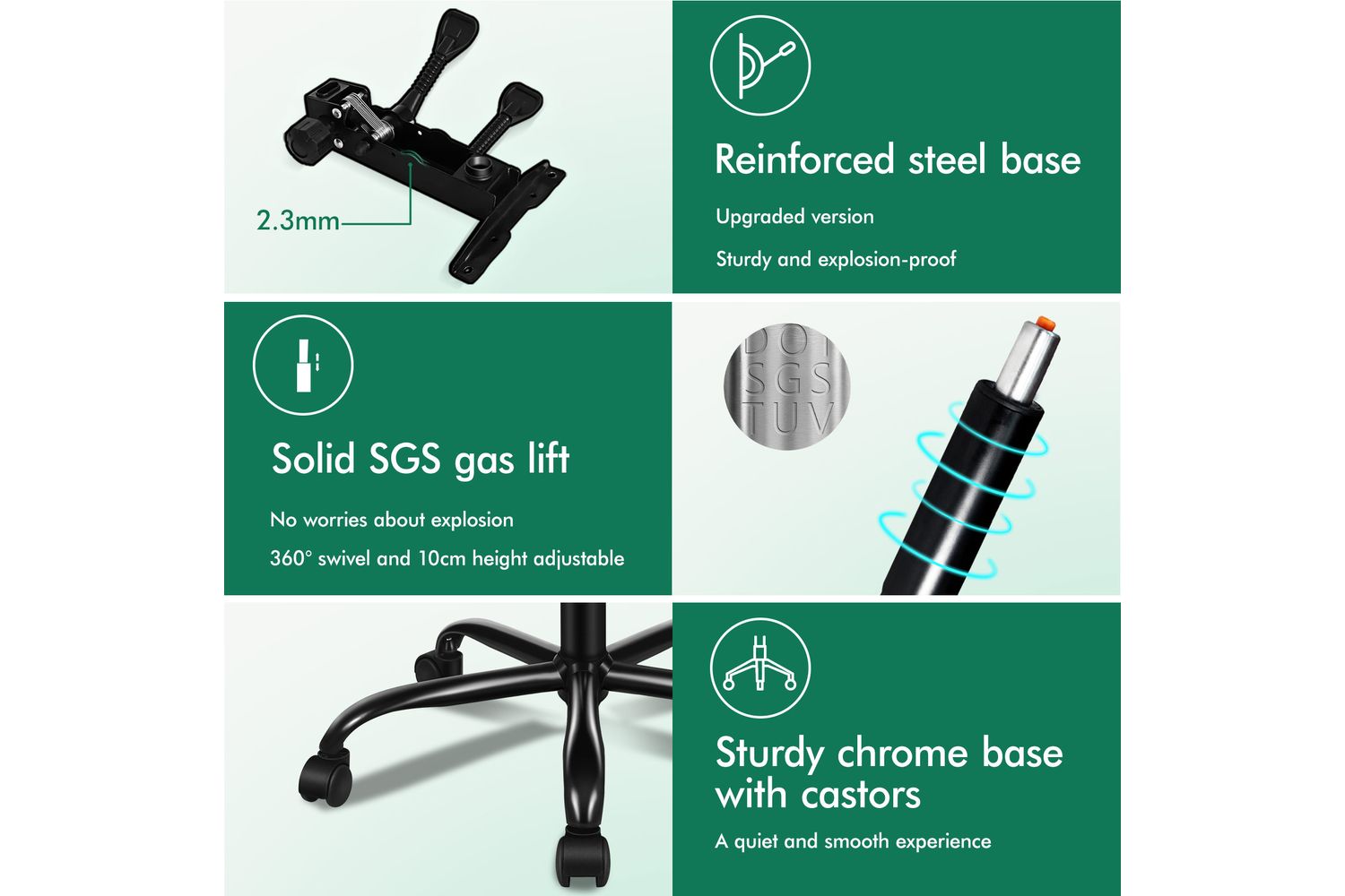 - Heavy-duty chrome base and TUV certified casters