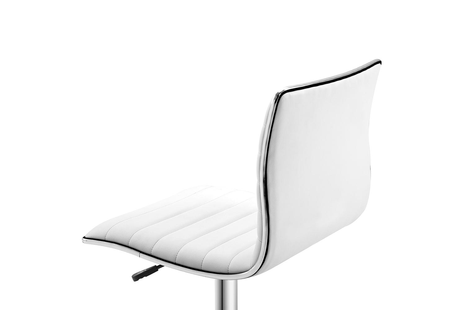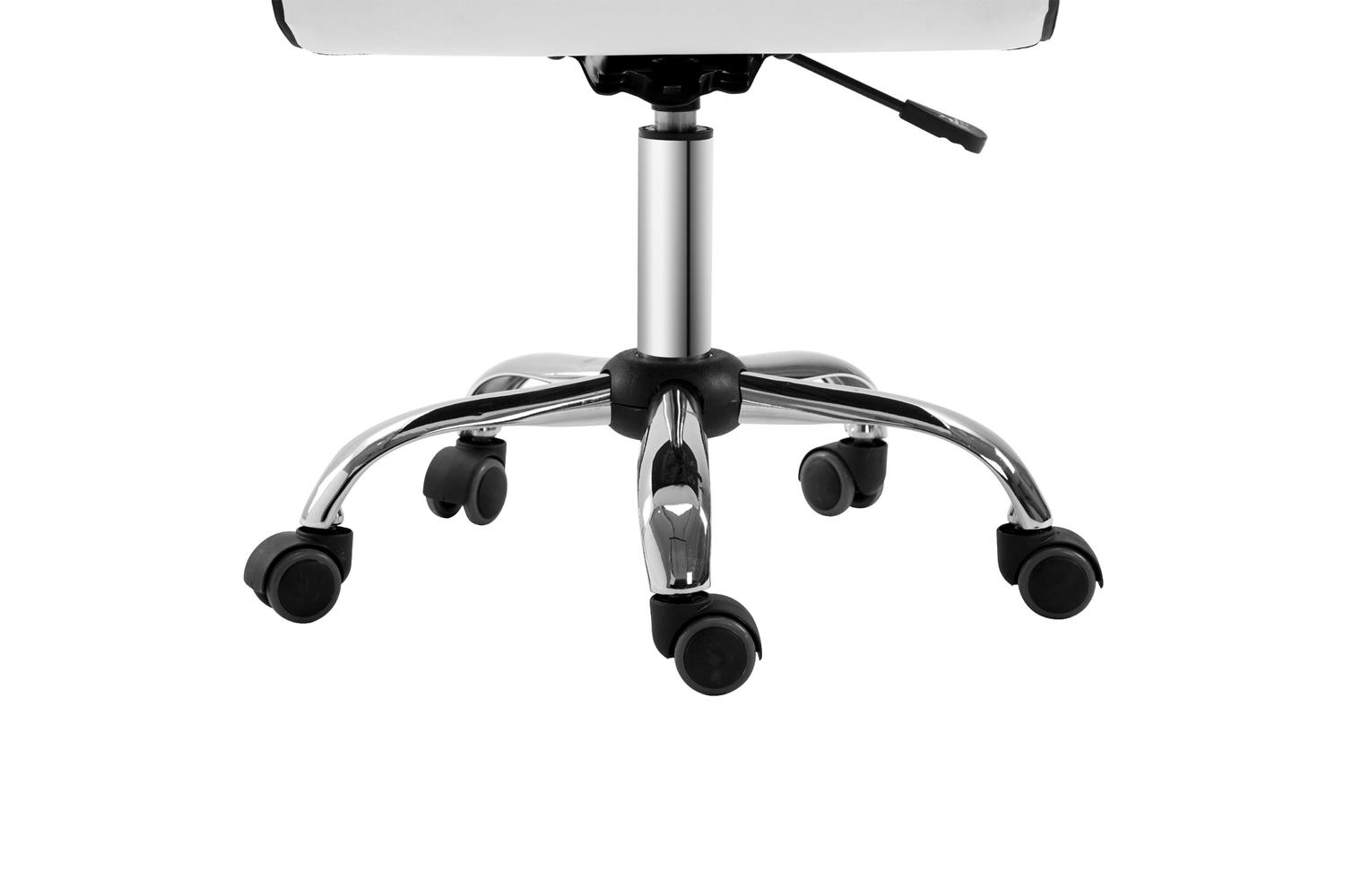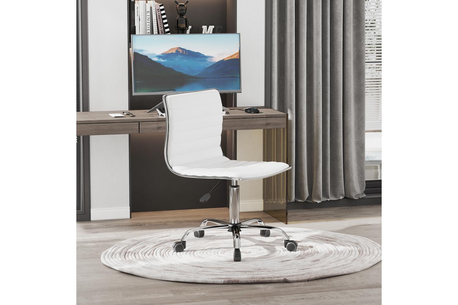 Very Happy with this white office chair. No arms so it sits nice and snug under the desk in our living room. This is chair is comfortable and does exactly what it is needed for. I love the modern sleek look of it too!!