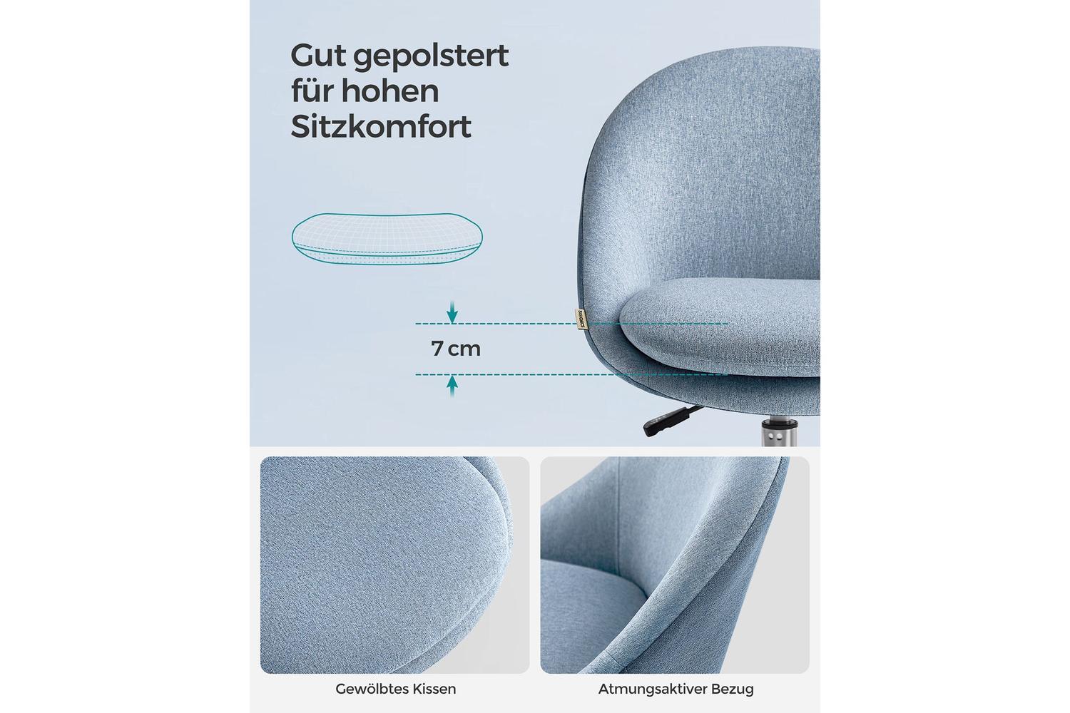 Crafted with a sturdy steel frame and upholstered in a soft cotton linen blend, this blue office chair adds a pop of colour and sophistication to your workspace. The breathable fabric ensures you stay cool and comfortable, even during those busy workdays. The high-density 28 kg/m³ foam padding provides exceptional support, while the adjustable seat height (47-57 cm) allows you to find your ideal sitting position with ease.