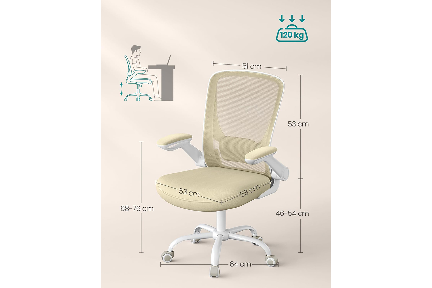 With its high-quality gas lift and robust metal base, this office chair supports up to 120 kg and offers solid and stable support.