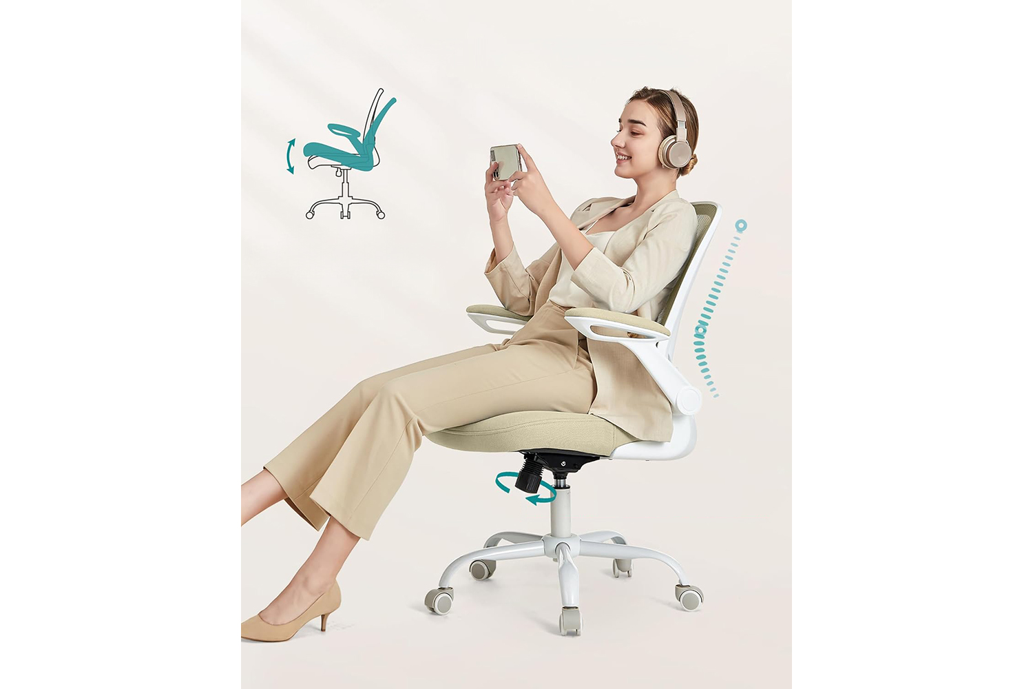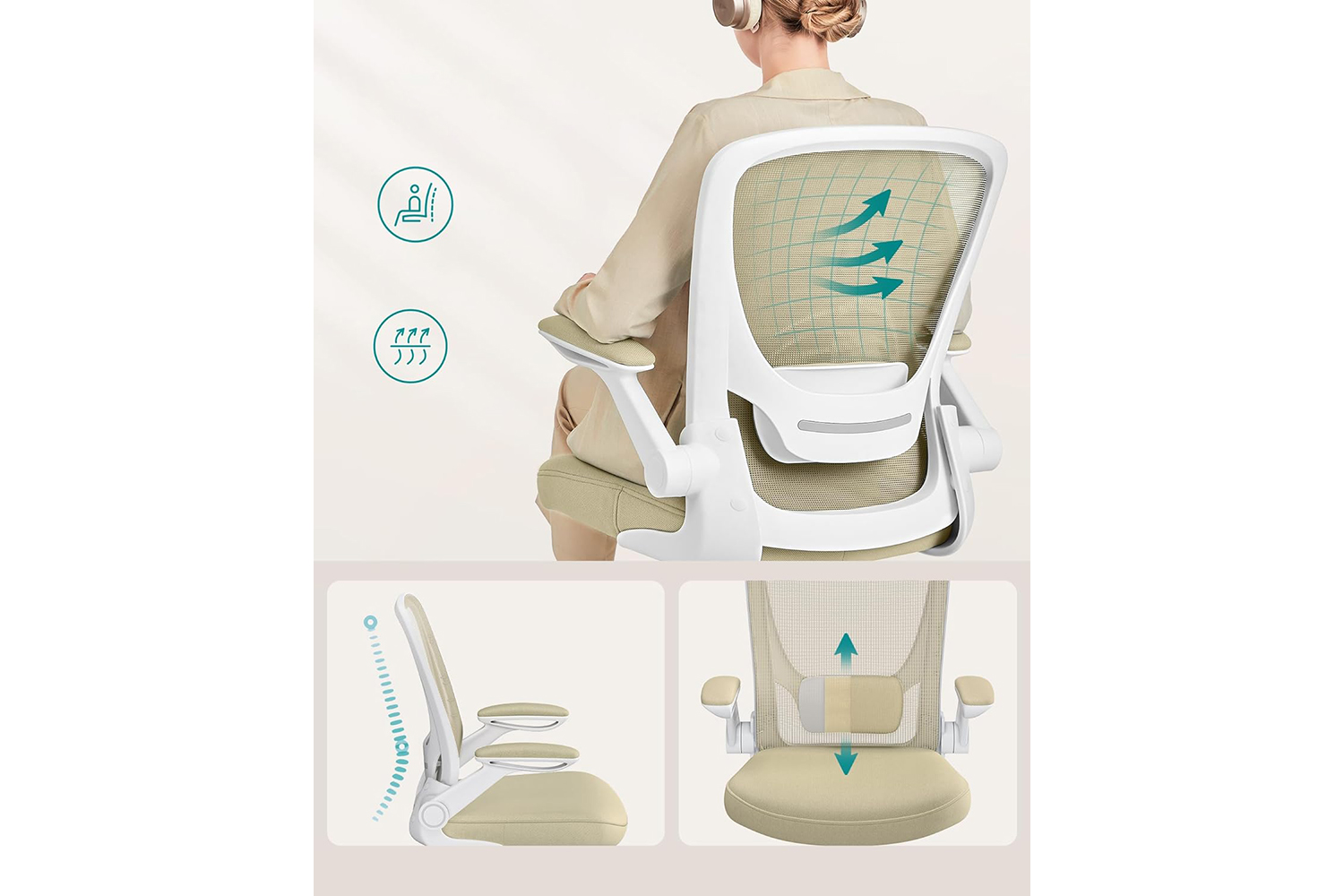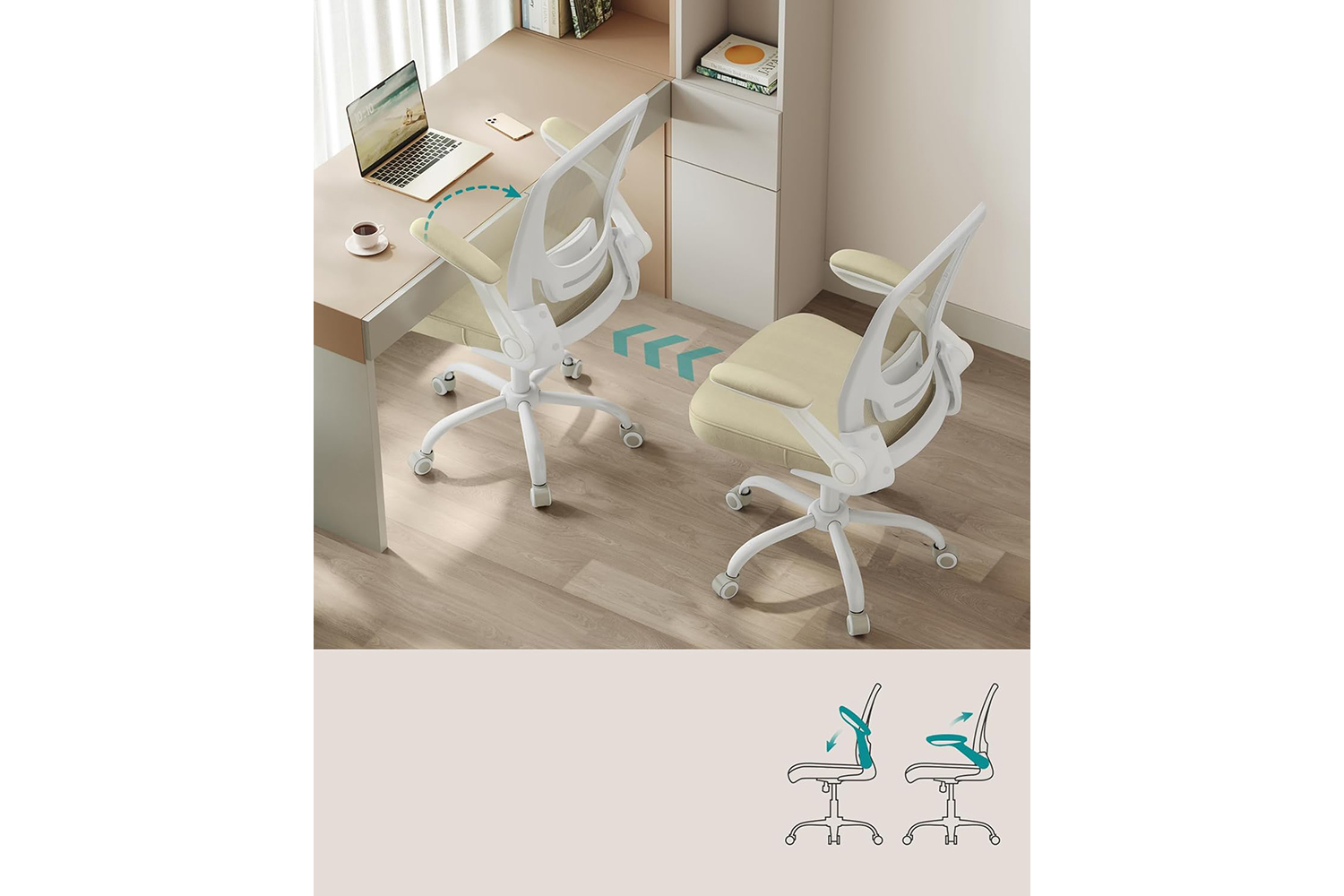 The seat height and lumbar support are adjustable; the armrests are foldable, allowing you to slide the chair under your desk when not in use; you can also activate the reclining function (90°-105°) to relax.