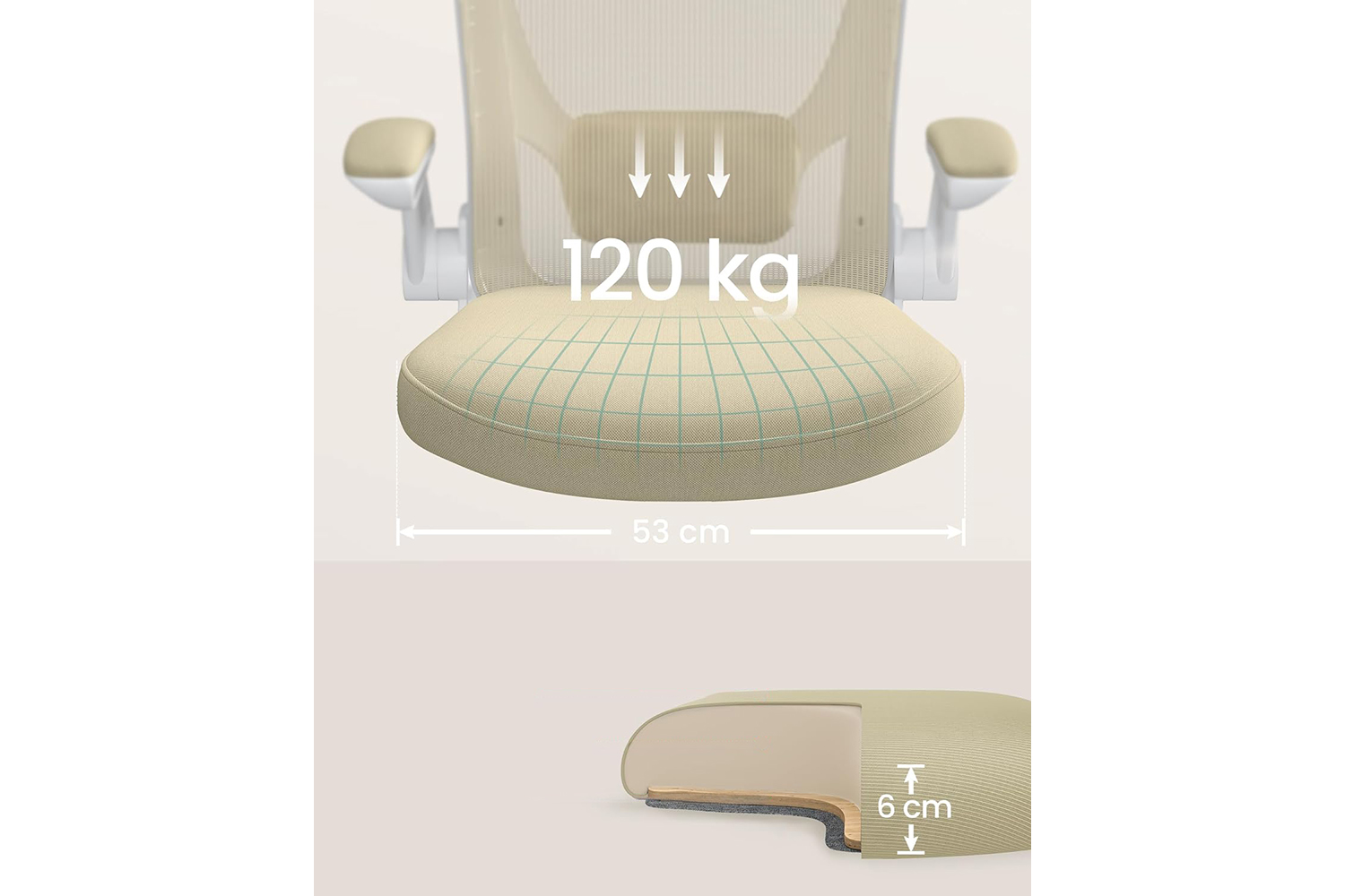 The high-quality 6 cm thick foam is neither too soft nor too firm; the soft padding of the 53 cm wide seat relieves pressure when you sit for long periods; the quality fabric is comfortable and breathable.