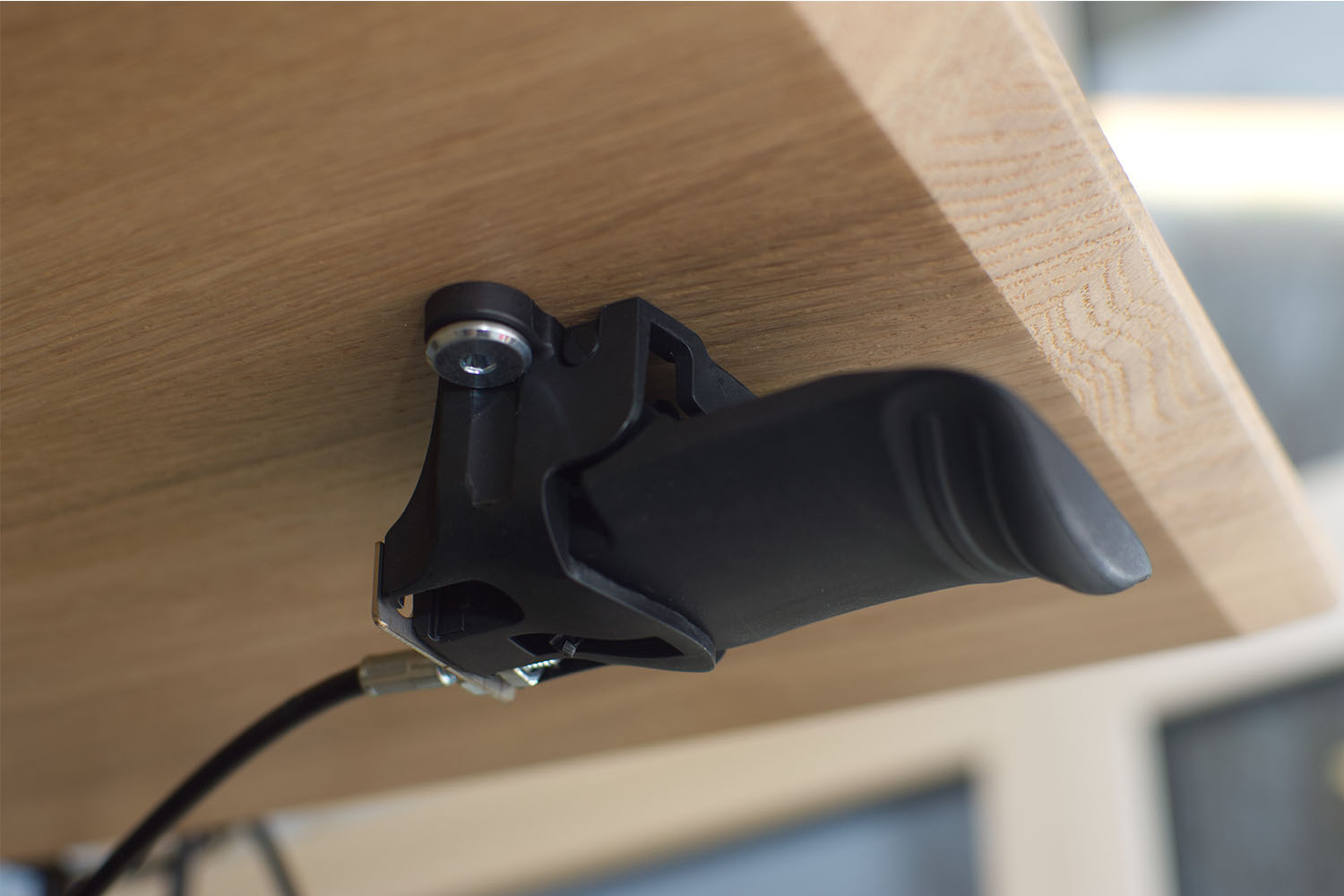 This home office wonder can adapt to your sitting or standing position. Simply press the handle under the tabletop and the gas spring lifts it higher. Release the handle to stop the movement. To lower the table top, press the handle, hold the tabletop with both hands and use your body weight to press it down until you find the height that’s just right for you!