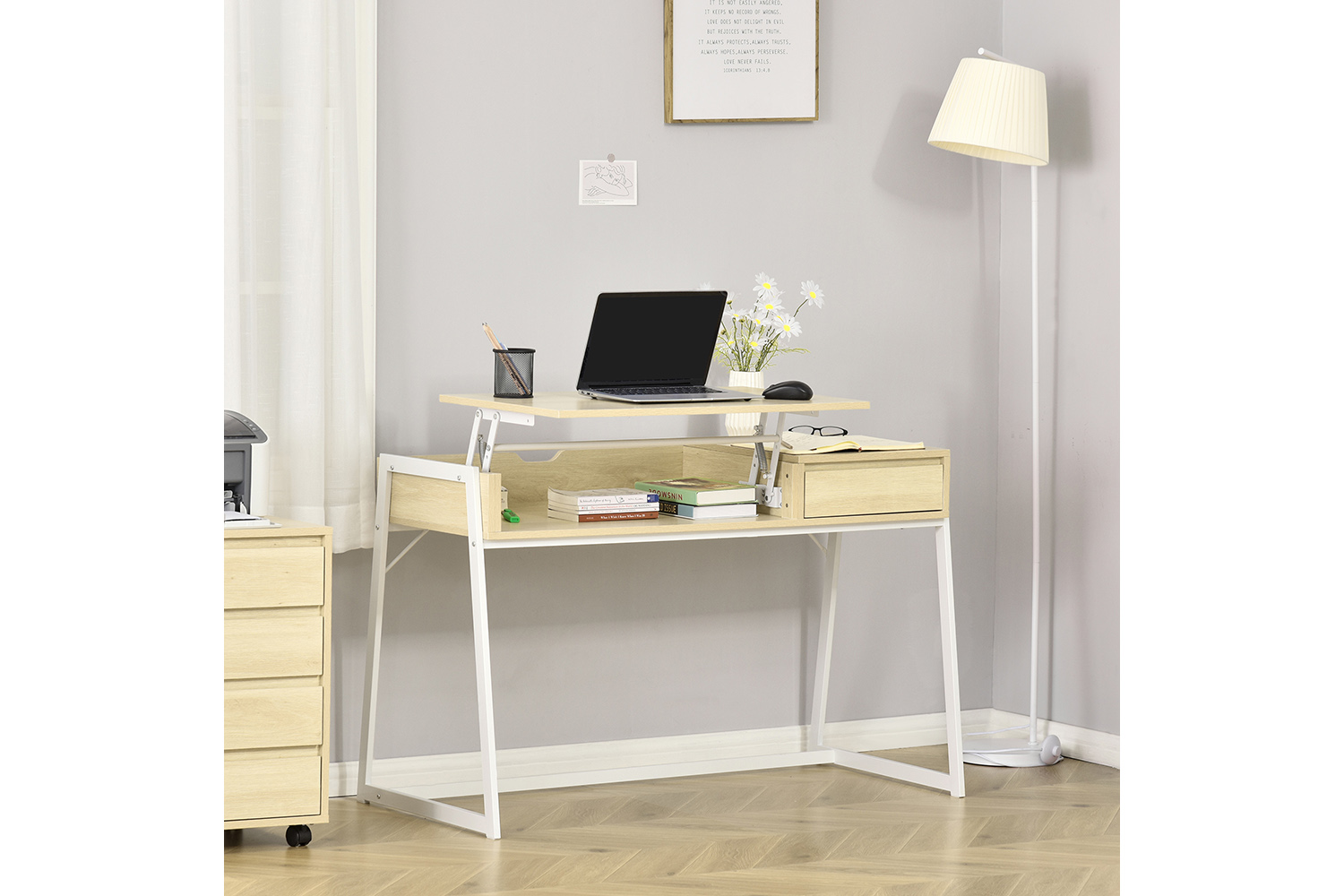 - A slide-out drawer and a storage cube provide ample storage space for storing supplies and documents separately