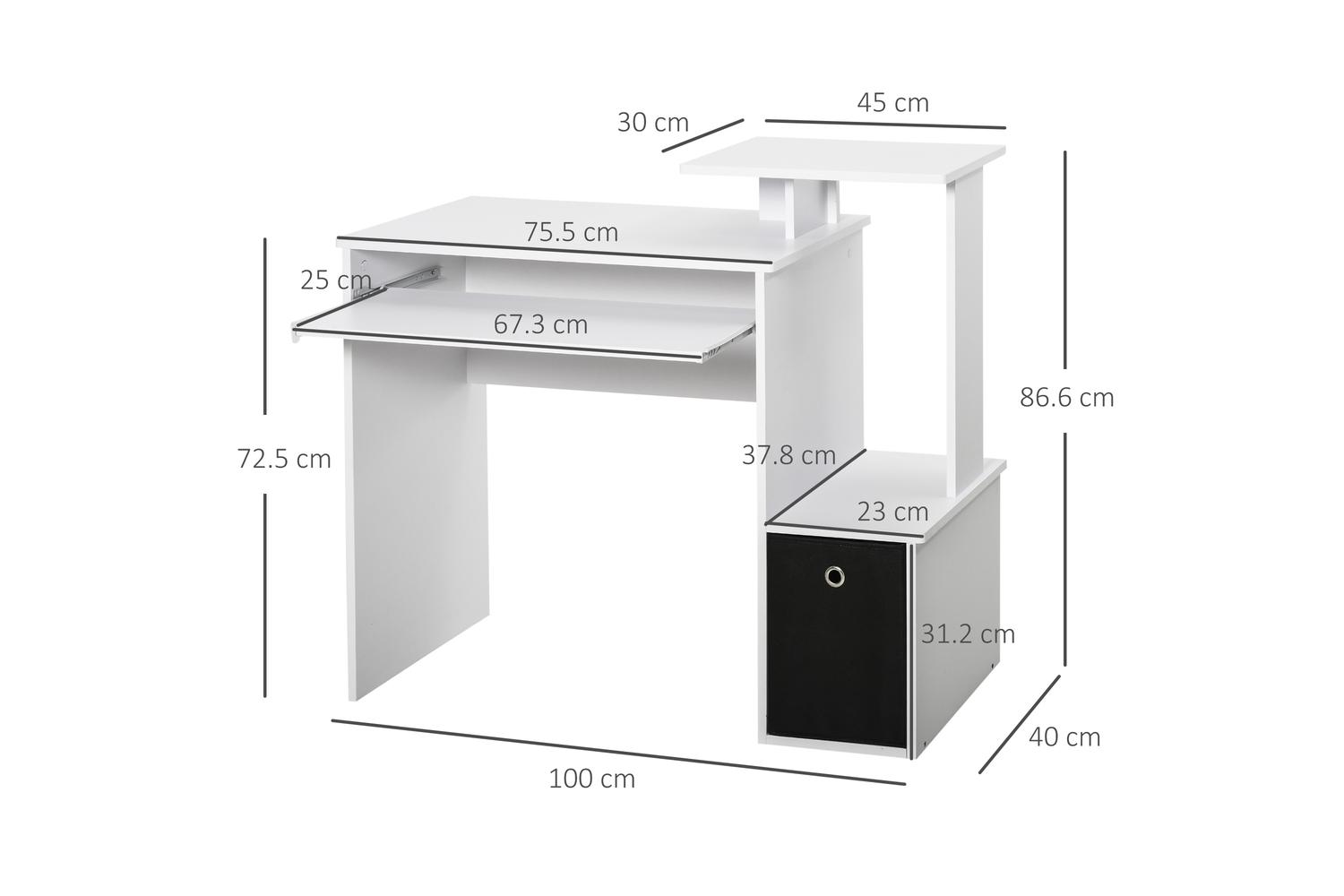 Designed with care, this HOMCOM desk ensures the table-top, keyboard tray, and open shelf are all conveniently reachable, helping keep your workflow running smoothly. The desk under-provides discrete storage in the form of a fabric drawer preserving your important documents, and any office staples.