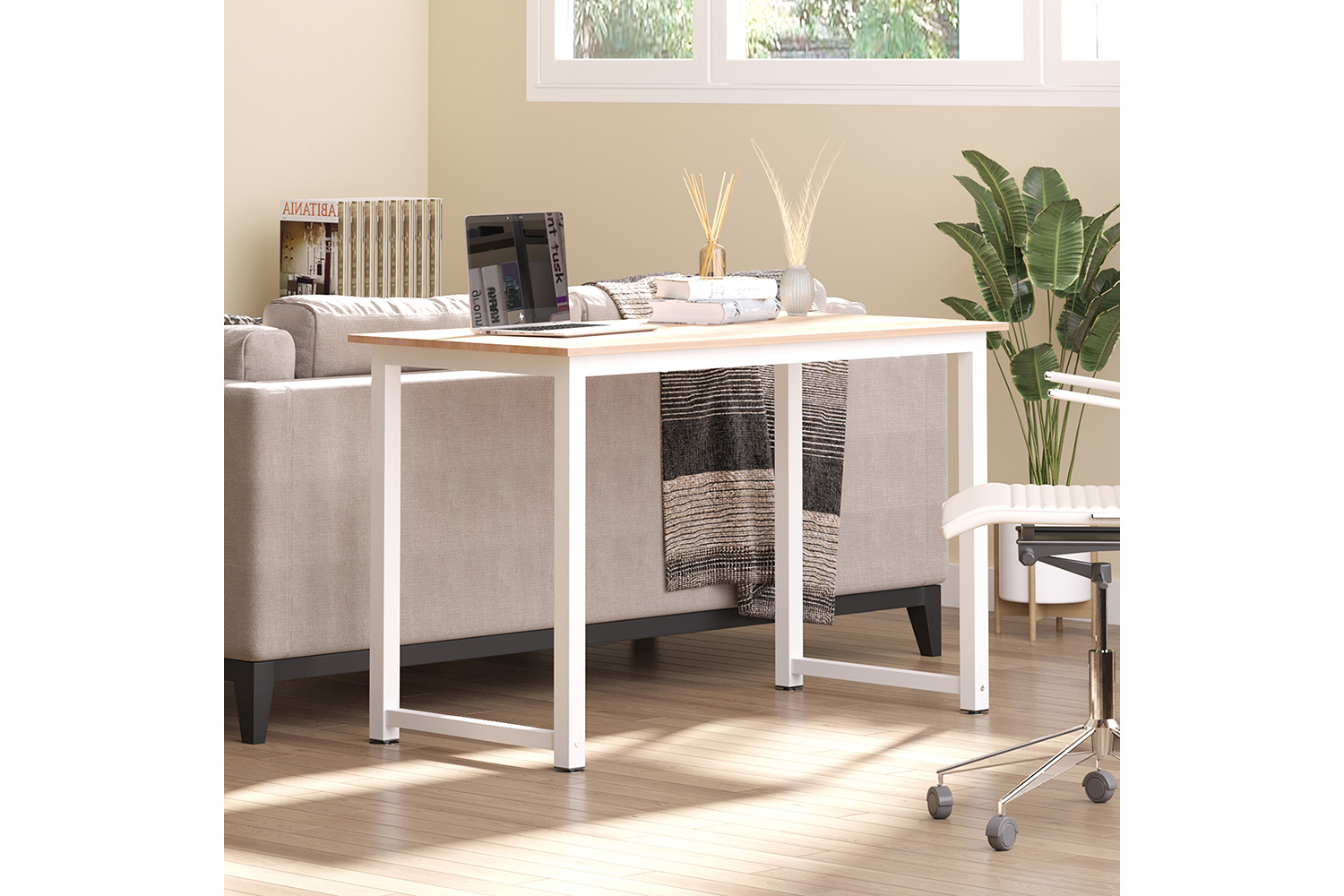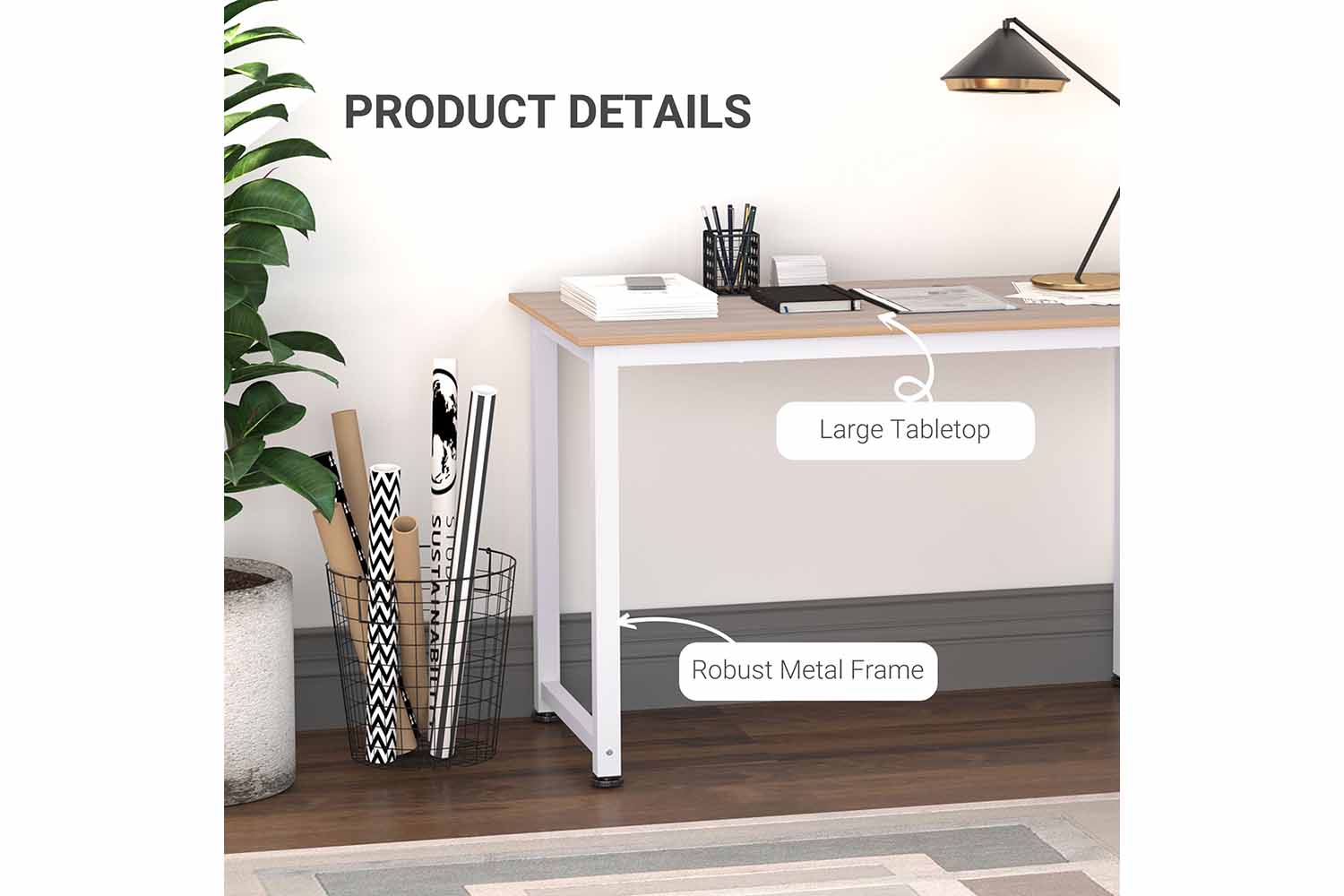 - Sturdy MDF top with a white metal frame for enhanced durability