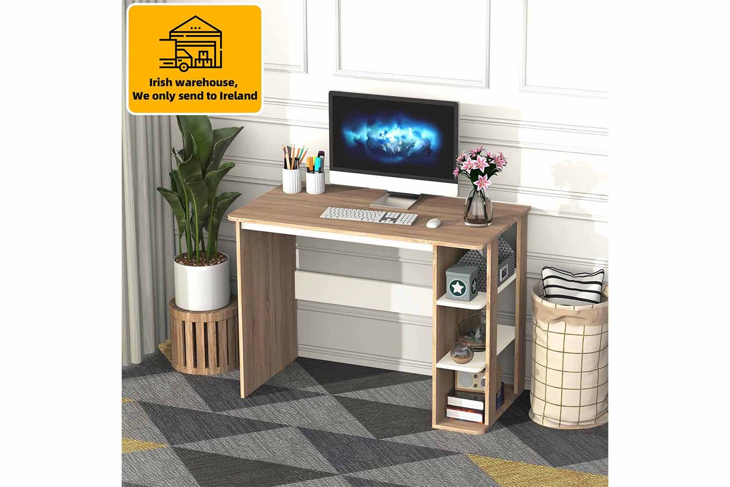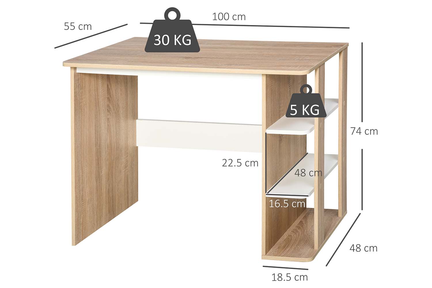 Homcom 2-in-1 design indoor decor mix 3-tier storage shelf and a desk. Completes in wood color and white makes it an all-match decor fits living room, bedroom, dorm, office using. The wide desktop and side 3-tier shelf for better organizing your office supplies and home decor. Reinforced particle board frame for added strength. Furniture from Homcom will always bring you better living experience.
