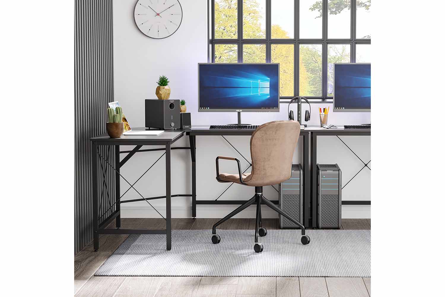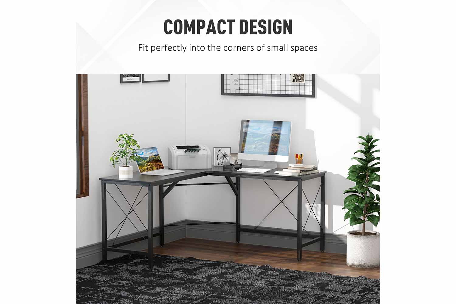 Work in style let your desk look as good as your work with this Industrial style computer desk. This Homcom L-shaped corner desk will fit into nearly any office in need of a space-saving alternative to overly bulky desks. Use it for work, writing, studying, gaming, or whatever brings joy to your day. Two compartments and an extra shelf provide a perfect home for your binders and books, but keeps them within easy reach. Get this right now and enjoy efficient work hours right now!