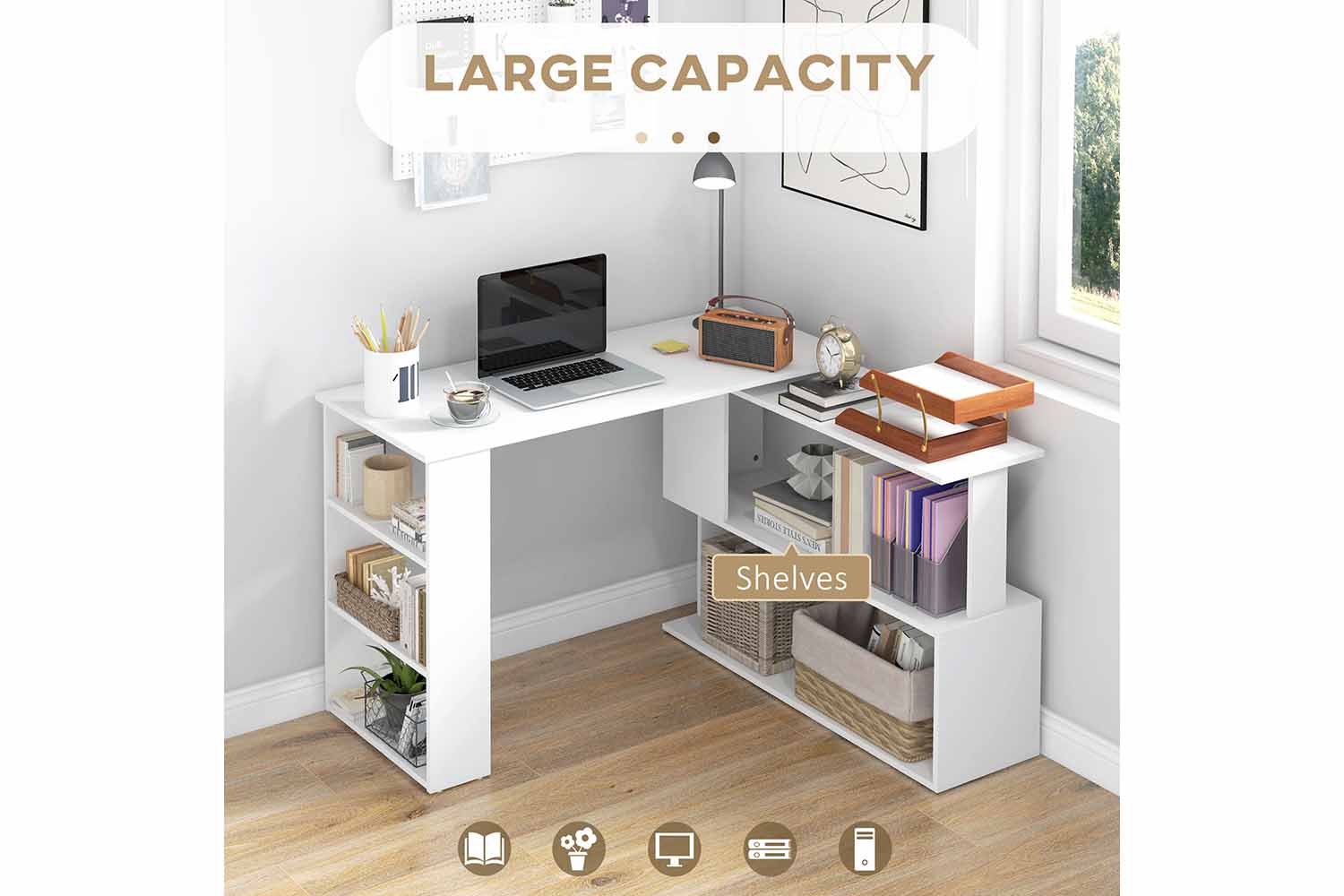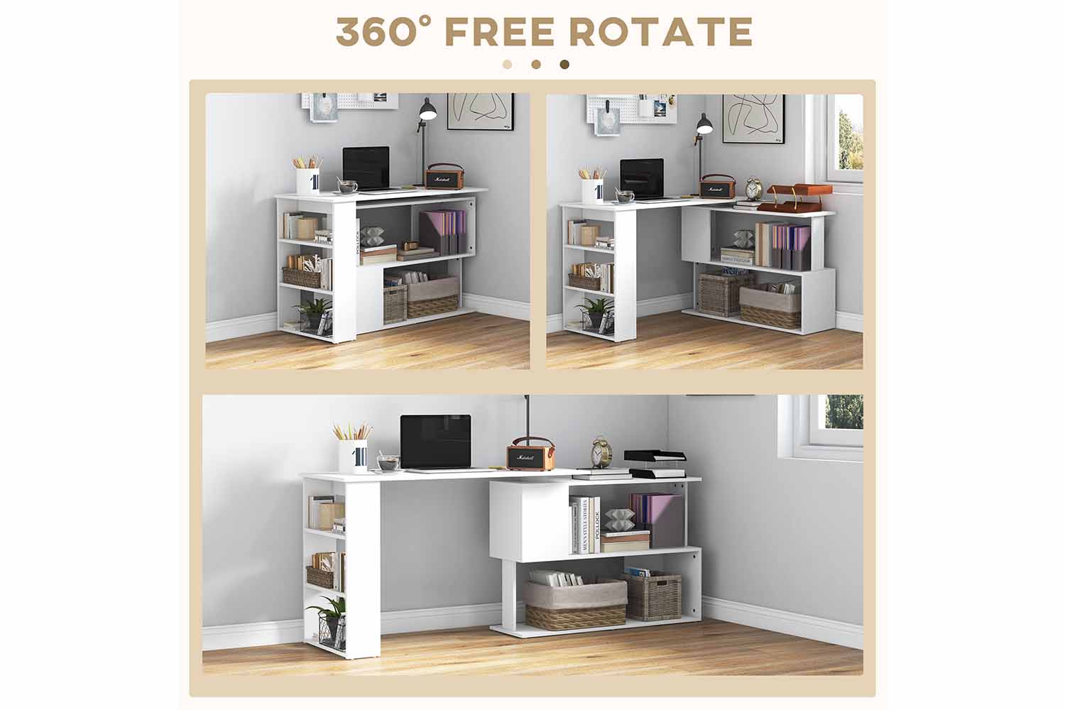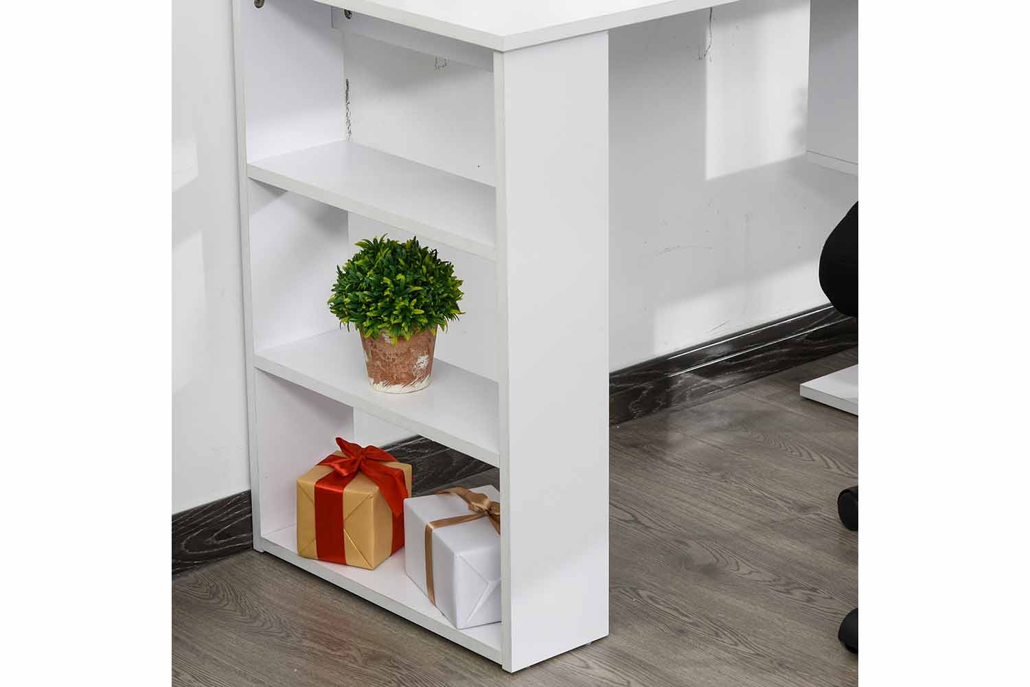 The Homcom L-shaped corner desk features an original 360 degree rotating design that can be adjusted to your needs and contains plenty of storage space. The modern look adds a touch of class to your office or home and is crafted from high grade materials. Multi-tier shelves provide ample storage space.Create a stylish working station, storage unit, and display case in one with this unique offering from Homcom.