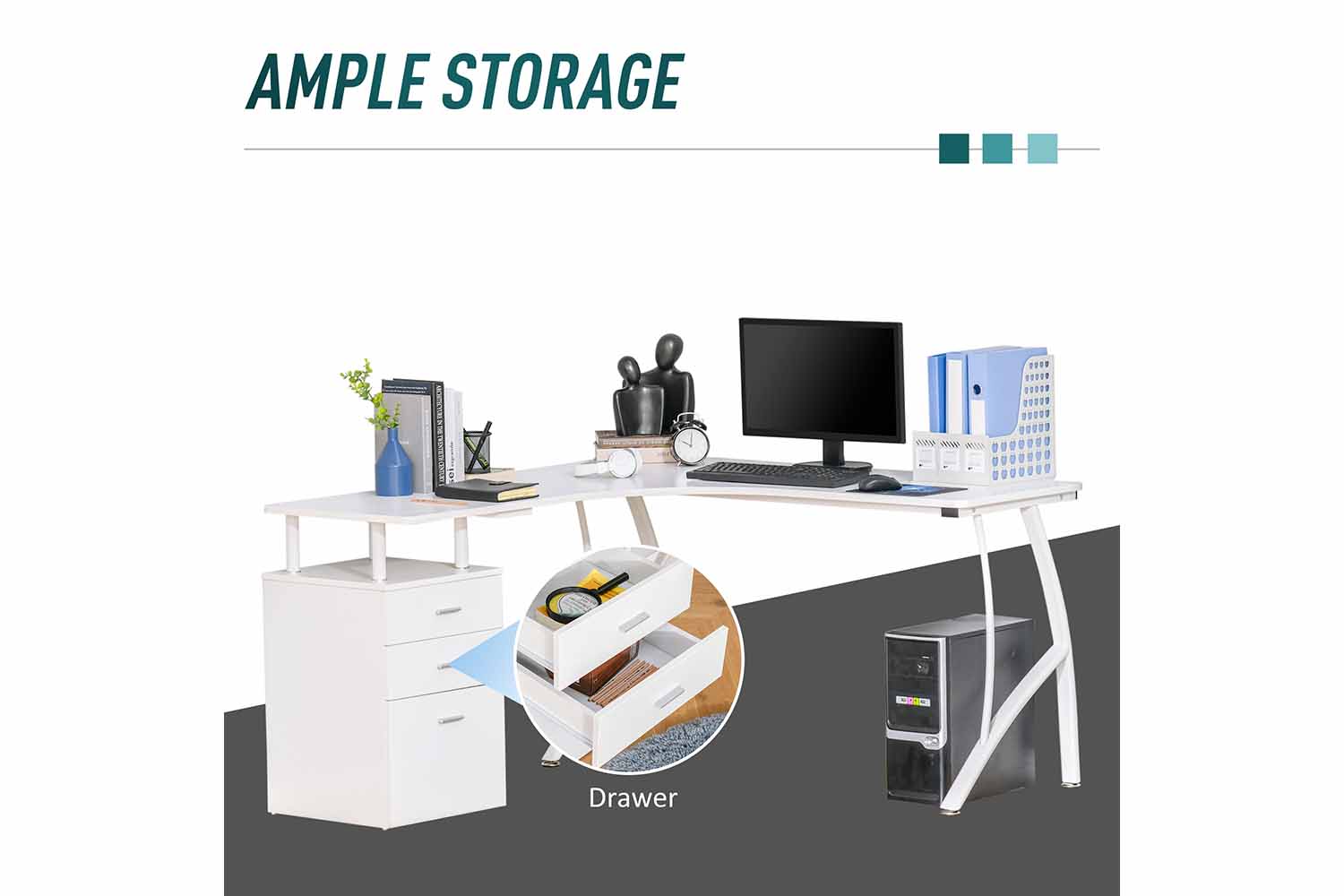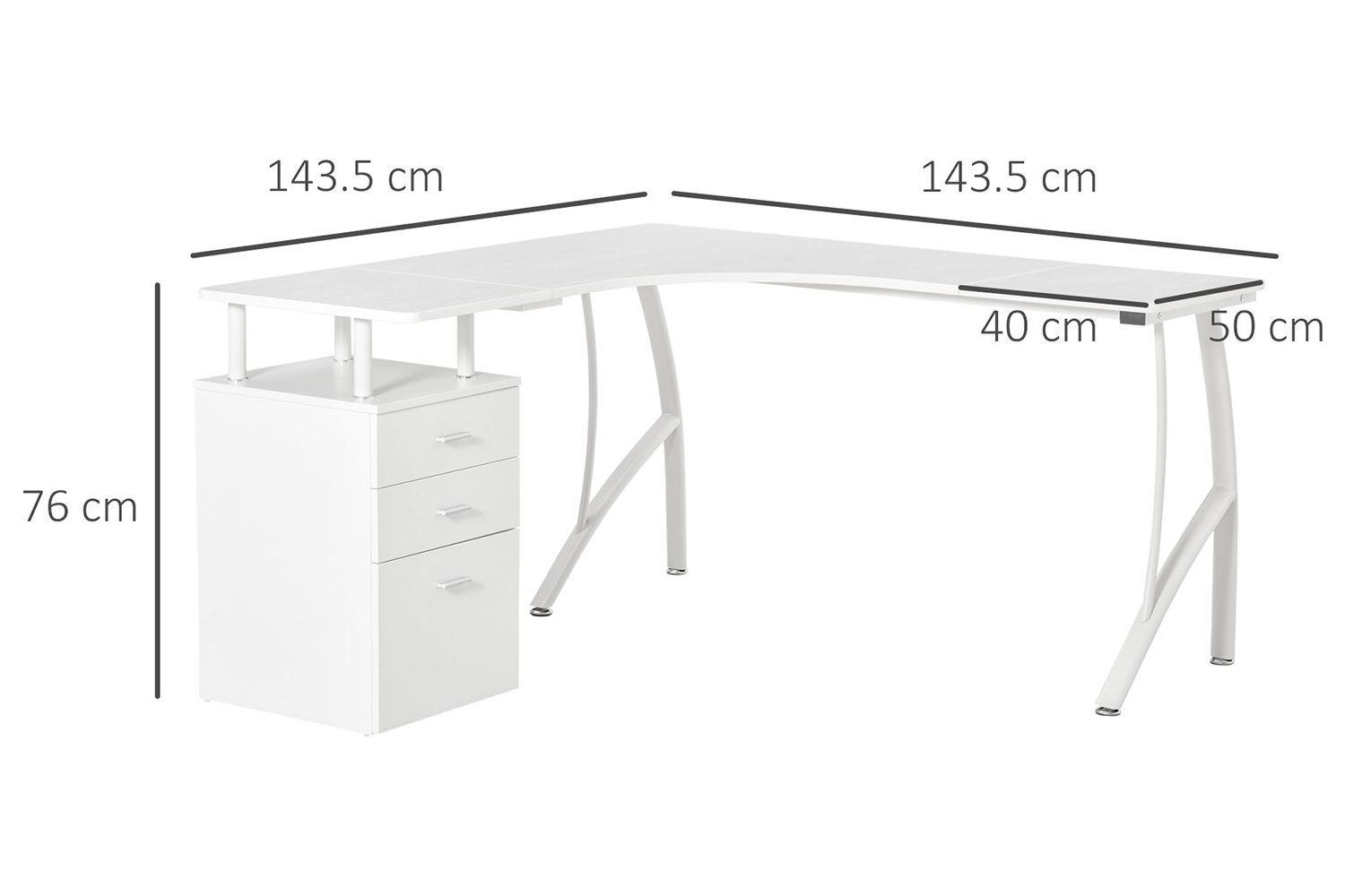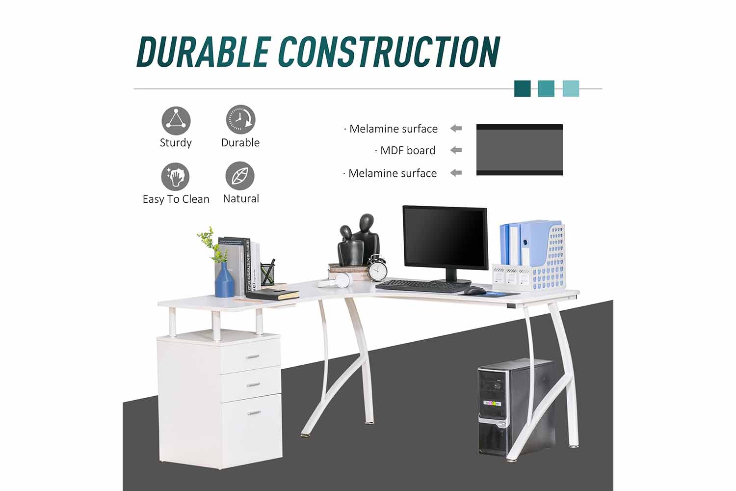 Modern and sleek, this work desk from Homcom looks as good as it feels when working, supporting you properly when you need to focus hard. Its 'L' shaped design fits perfectly into corners to help utilise space more efficiently. The frame is made from steel frame for a tough structure, fitted with MDF shelves so you can work well. There's plenty of space to work and have your computer and other devices on top. It's finished with a three-drawer cabinet so you can keep papers and more safely stored.