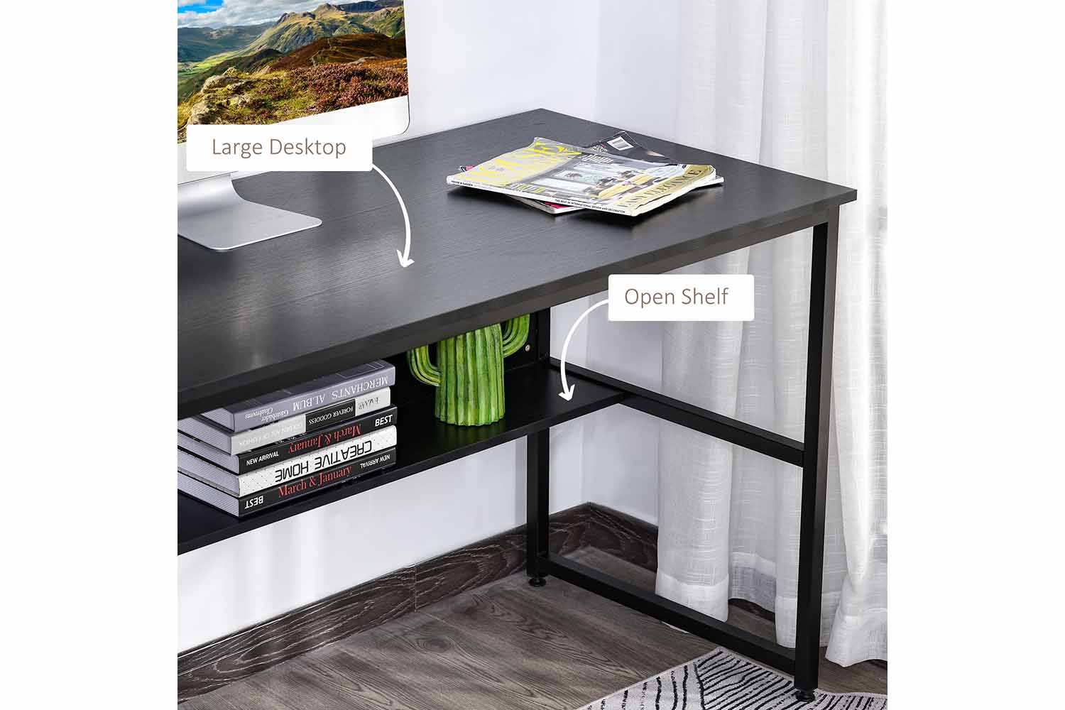 - Two-tier design: features a large top shelf for working from, with a bottom shelf with a back panel for safe holding and storage