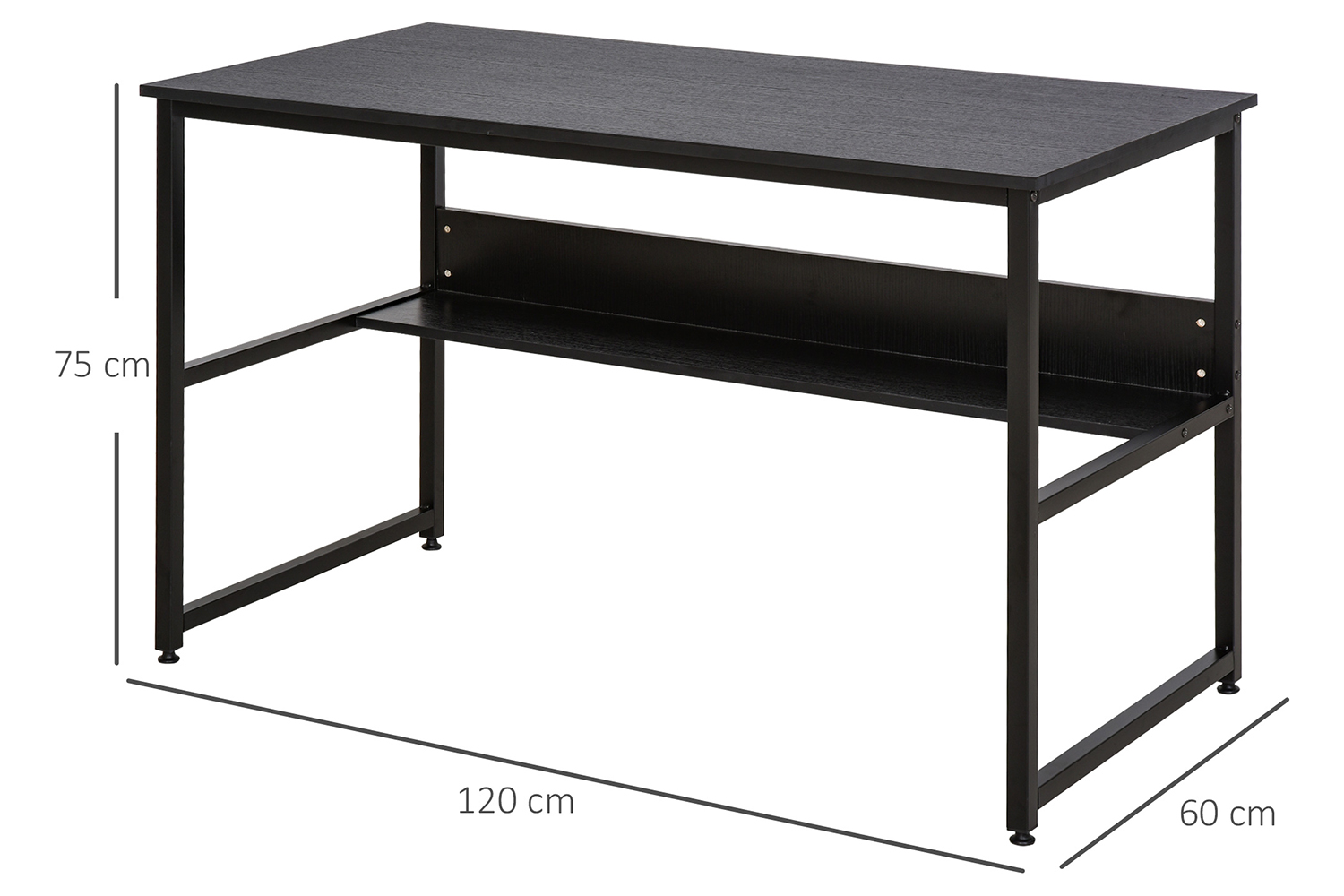 Create the perfect environment for working from home with this two-tier desk from Homcom. It uses a metal frame for a tough and sturdy structure, with thick particle board shelves for a solid and flat surface to work from. Both shelves are covered with melamine, meaning they are smooth and are protected against lighting marks and damage. The bottom shelf features a back panel, which allows safe storage which is also out of sight. It sits well placed anywhere. An easy way to make work enjoyable.