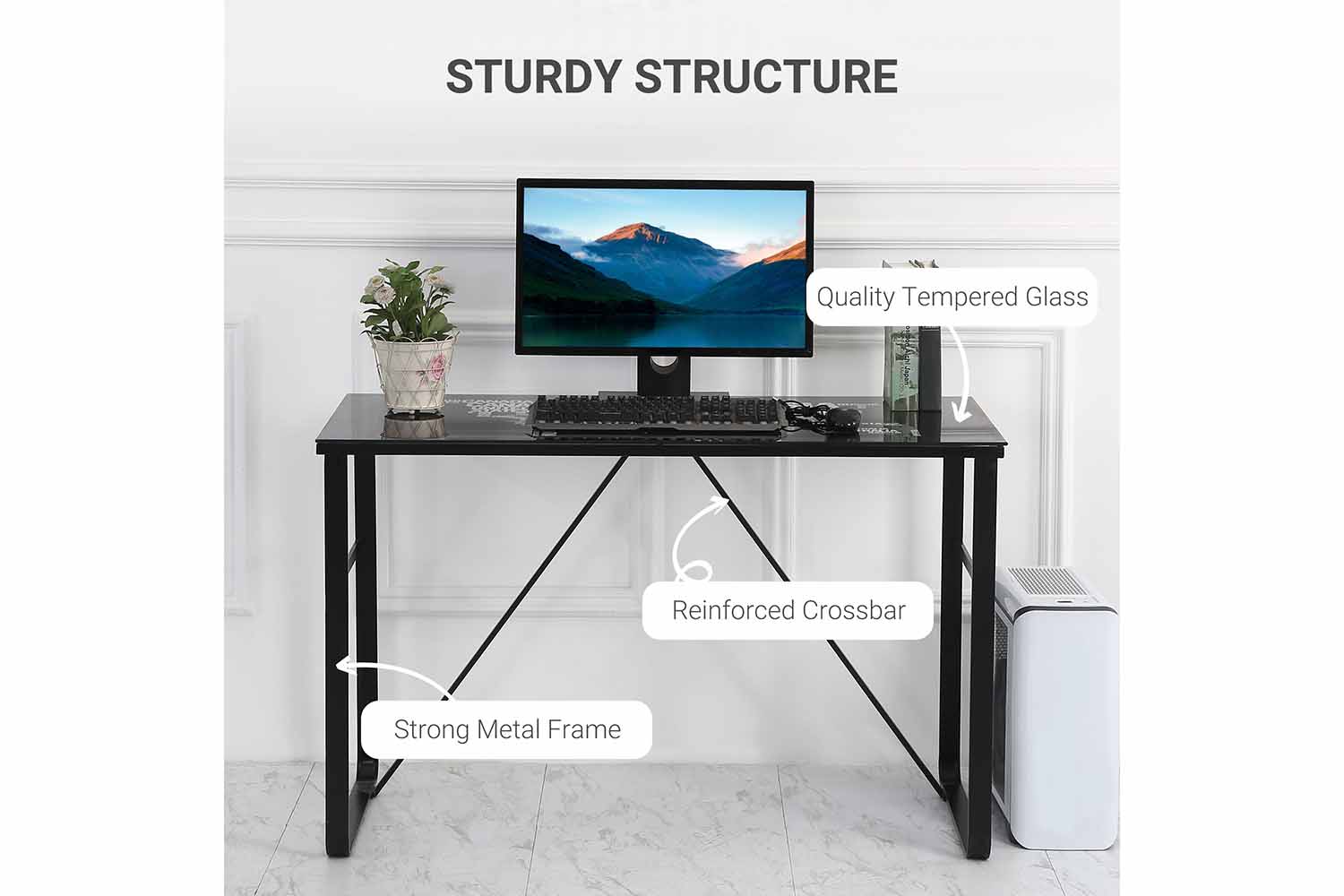 - Tempered glass desktop which is easy to clean - Total 4 stable feet to keep the desk in balance