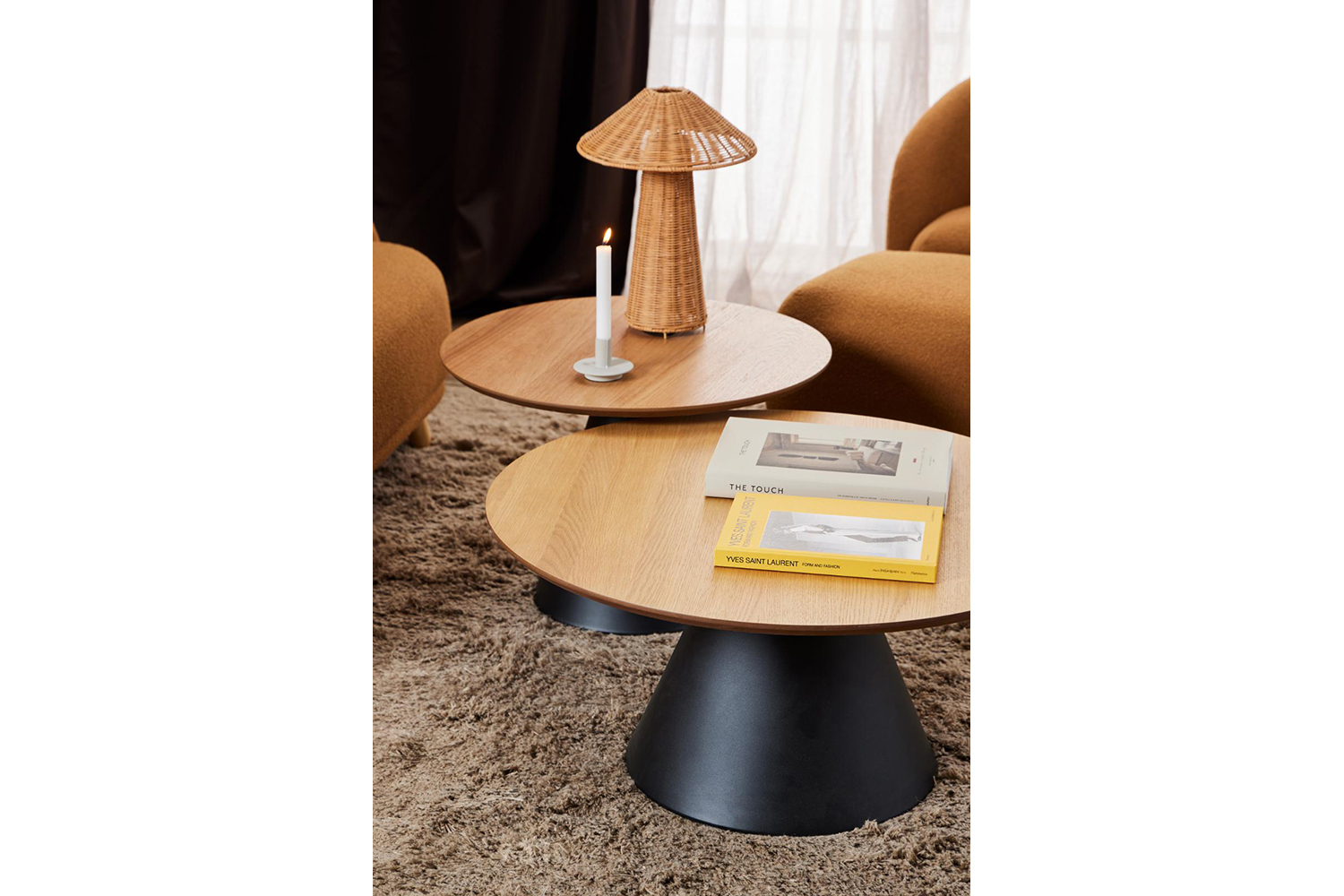 Boasting an exclusive Danish design, the Soli coffee tables exudes minimalist excellence that’s designed to be noticed. It features a circular wooden tabletop with a lacquered oak veneer finish that enhances the woods knots and grains elevating this look and giving a warm and cosy feel. This rests upon a steel black metal pillar base that brings contrast to this piece. It’s available in two different sizes and multiple different colours.
